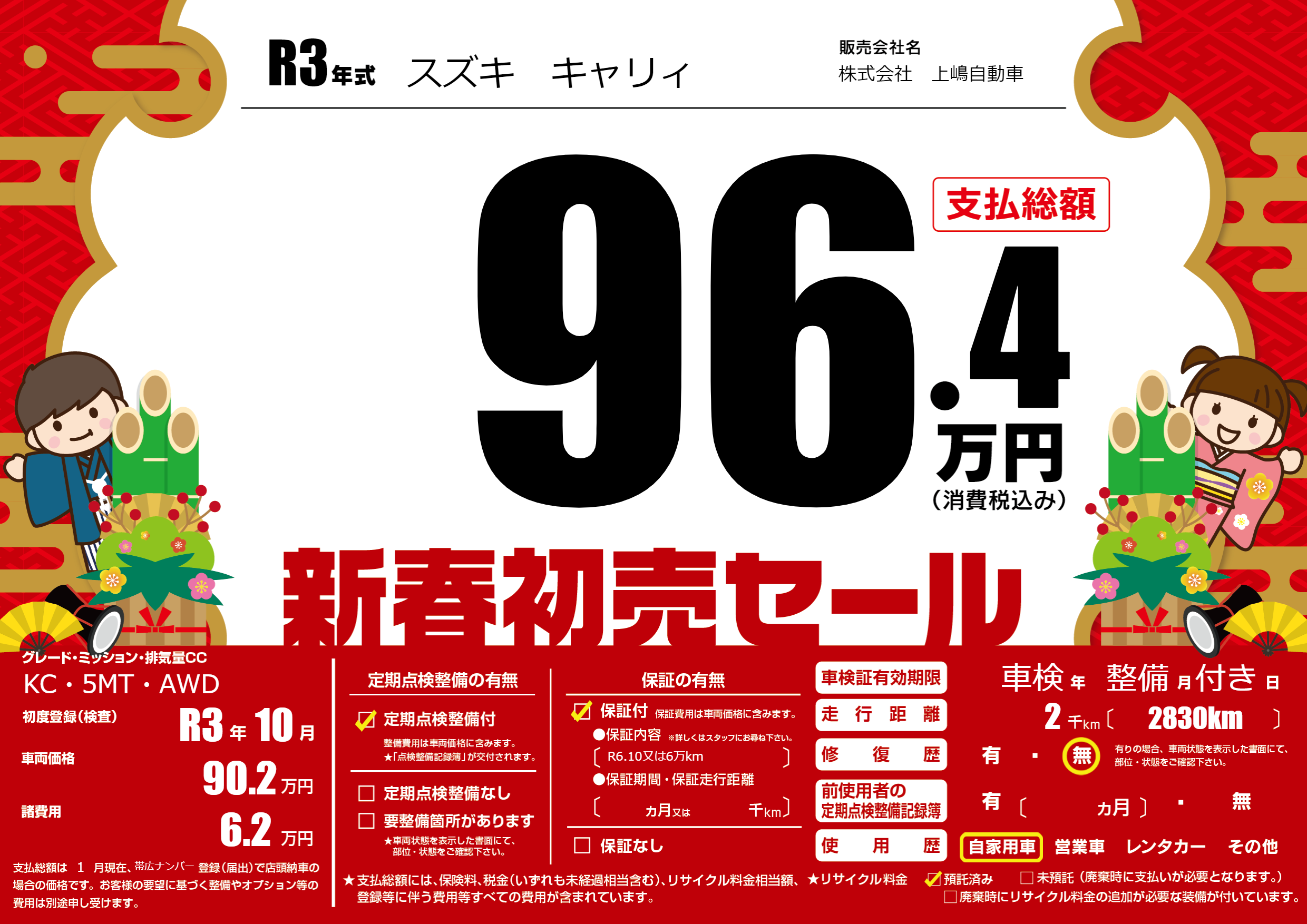 保証付き 保証内容(R6.10又は6万km) ---ヶ月または()千kmまで |