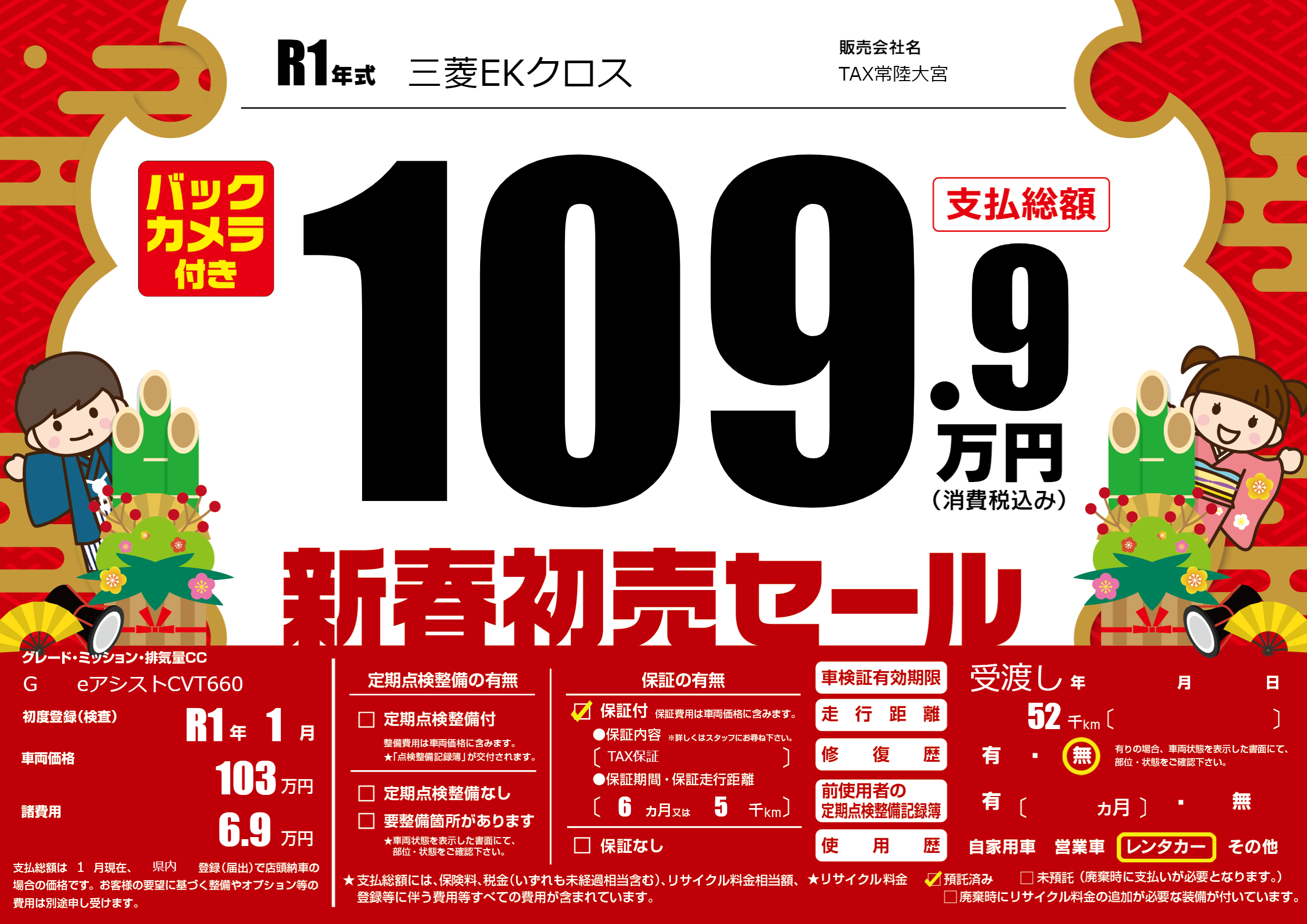 保証付き 保証内容(TAX保証) 6ヶ月または(5)千kmまで |