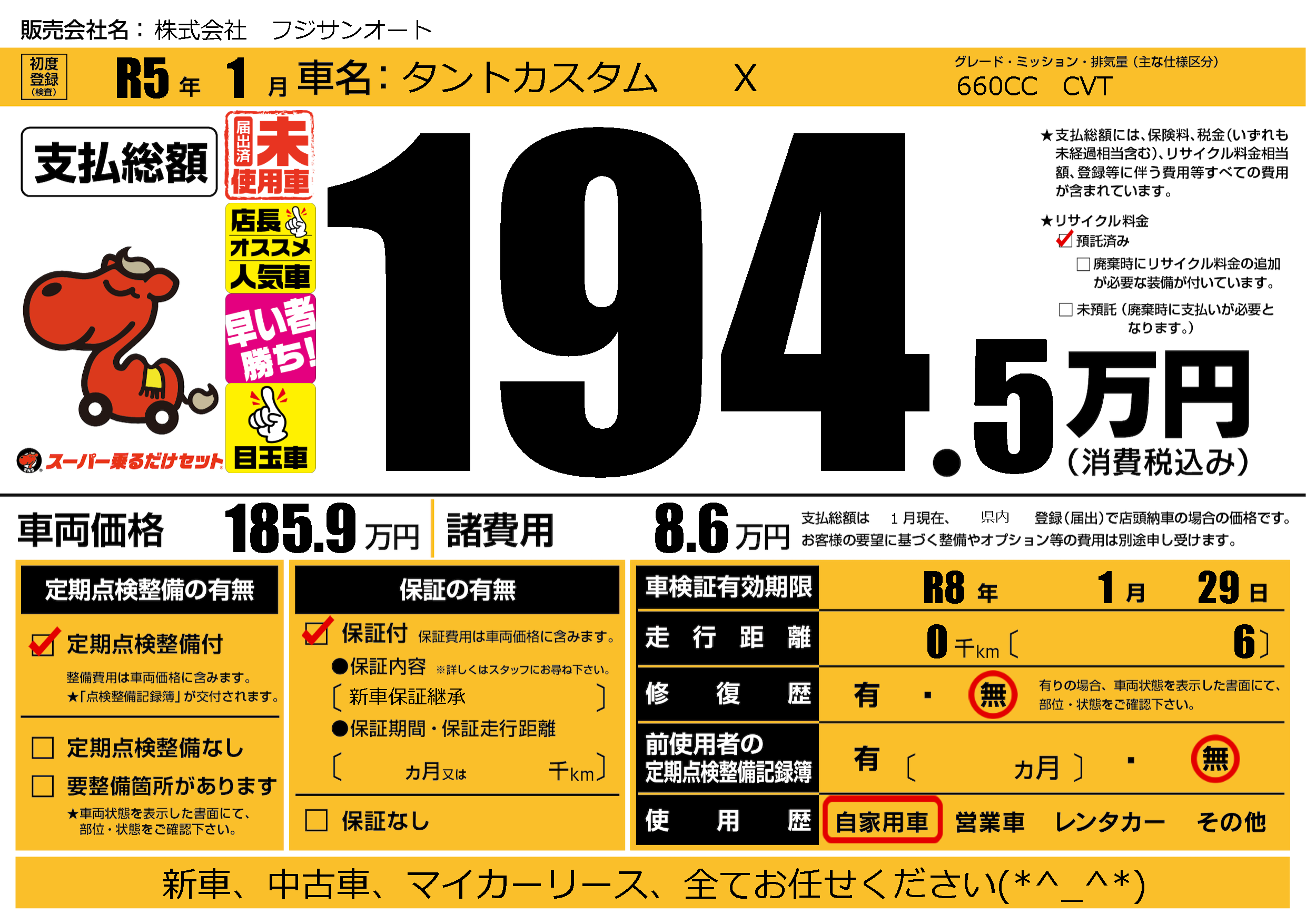 | 車名 | タントカスタム X | グレード ミッション 排気量 |