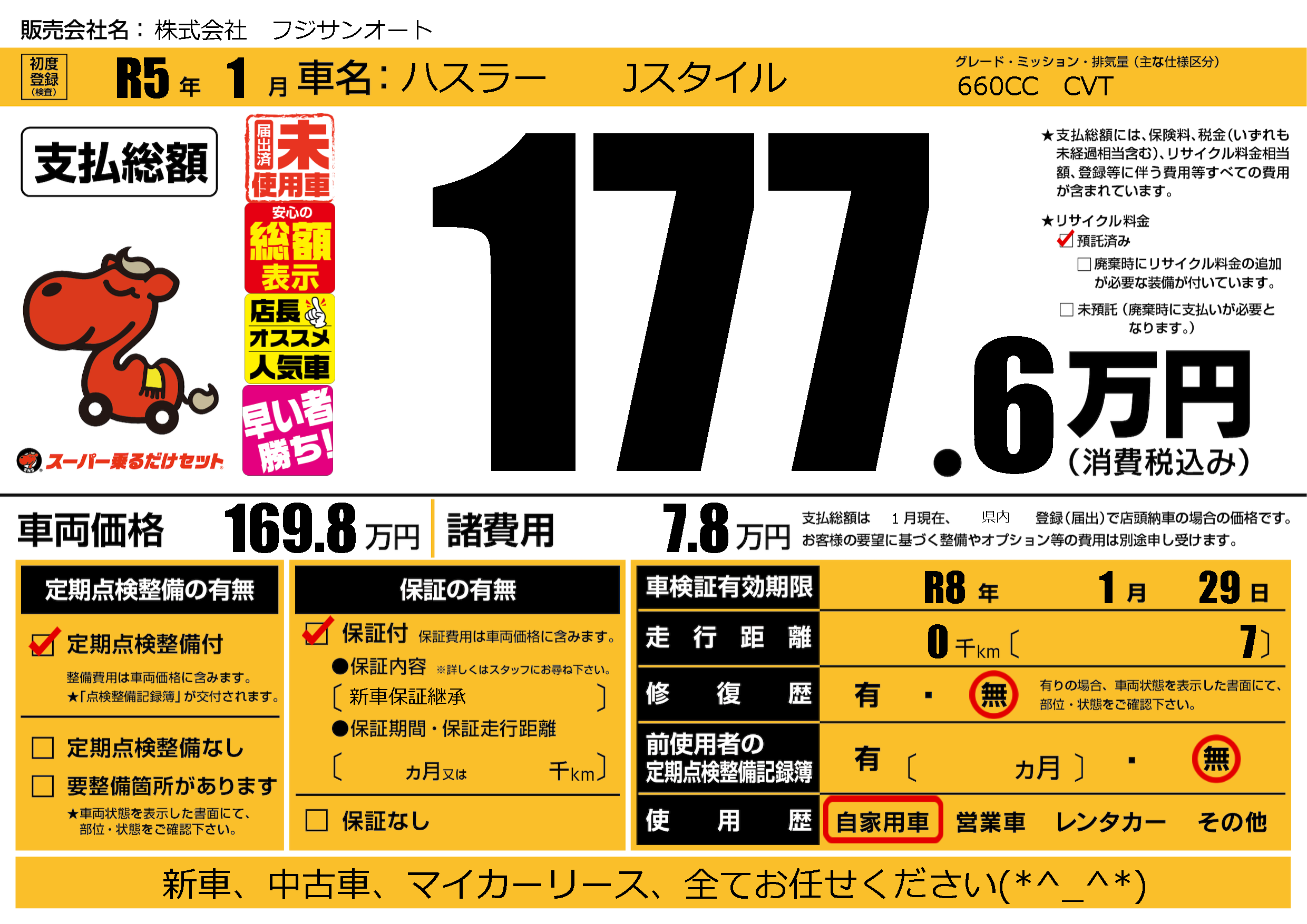 | 車名 | ハスラー Jスタイル | グレード ミッション 排気量 |