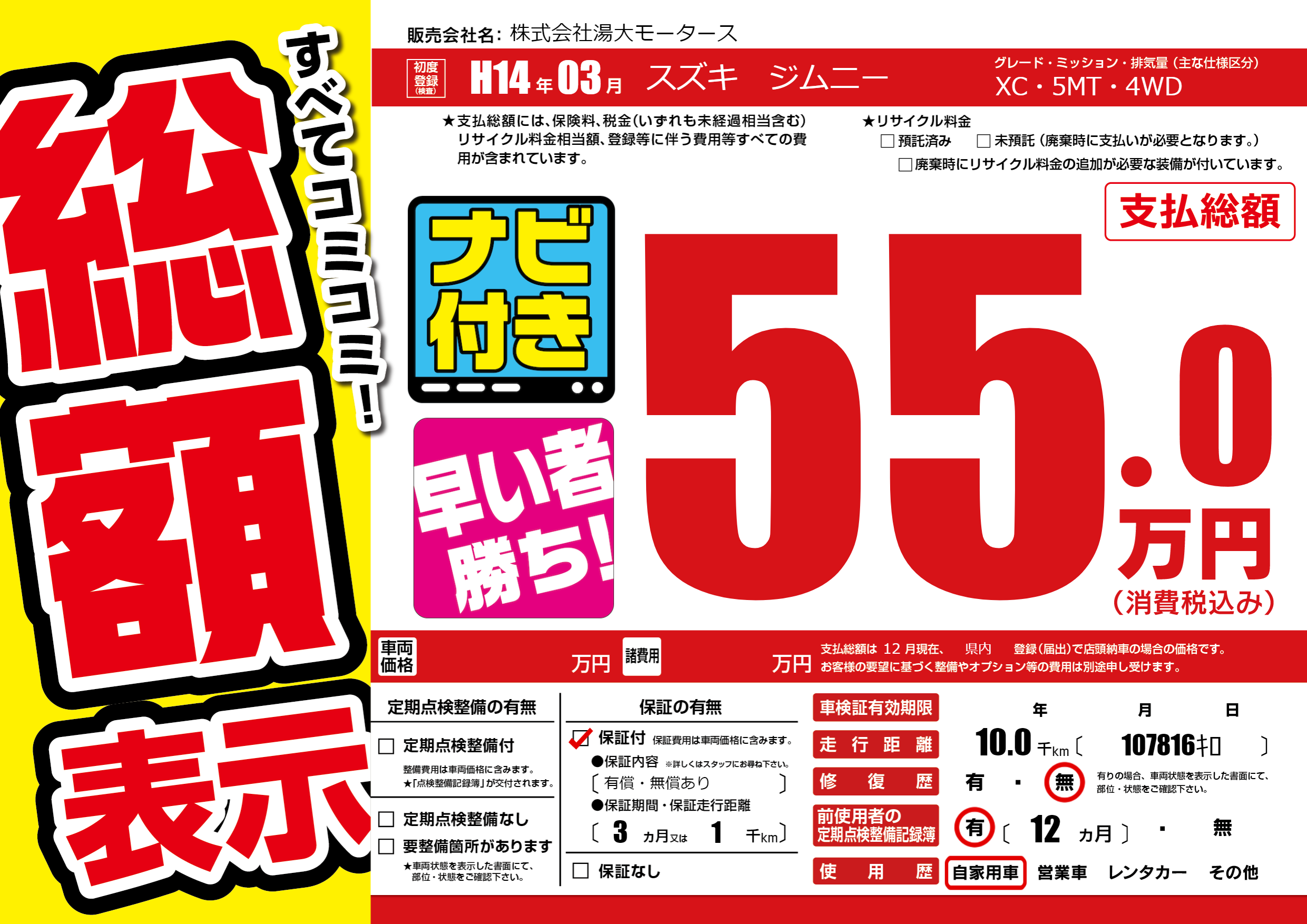 | 車名 | スズキ ジムニー | グレード ミッション 排気量 |
