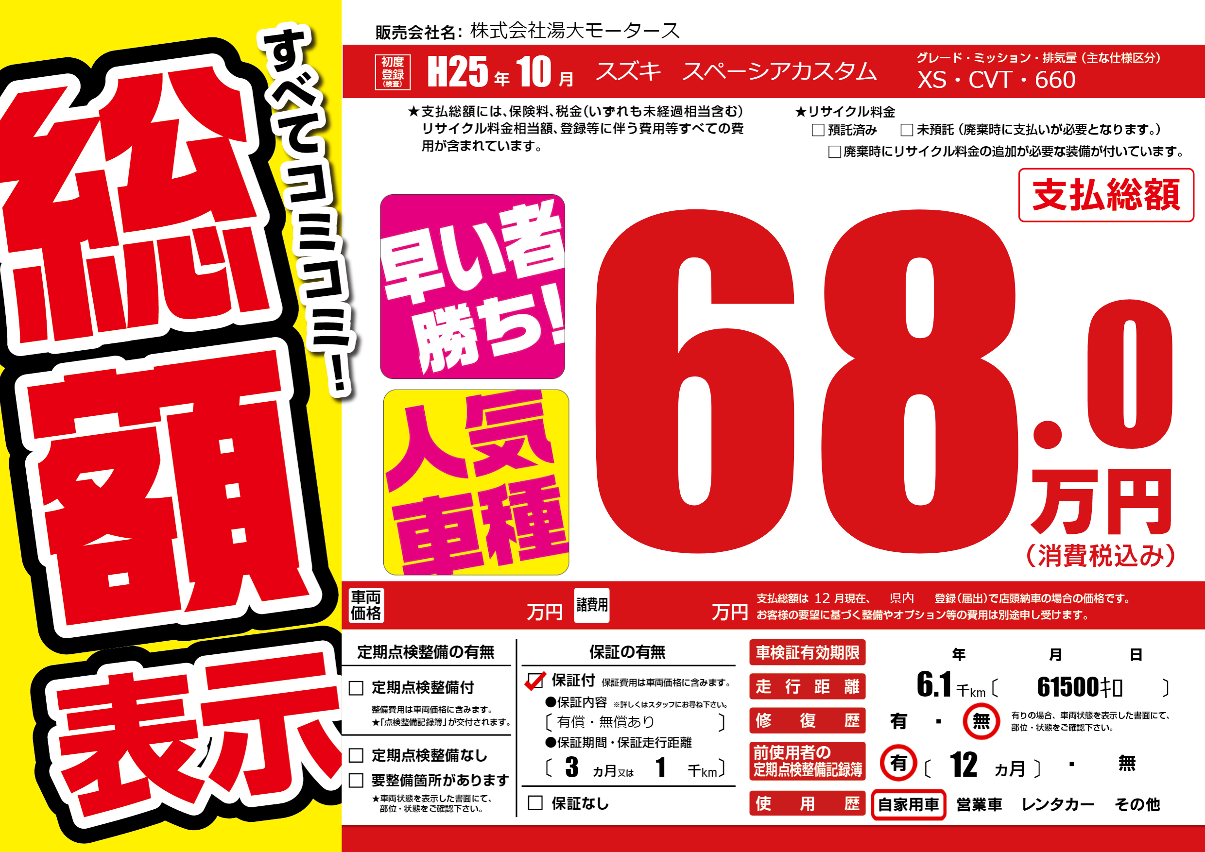 | 車名 | スズキ スペーシアカスタム | グレード ミッション 排気量 |