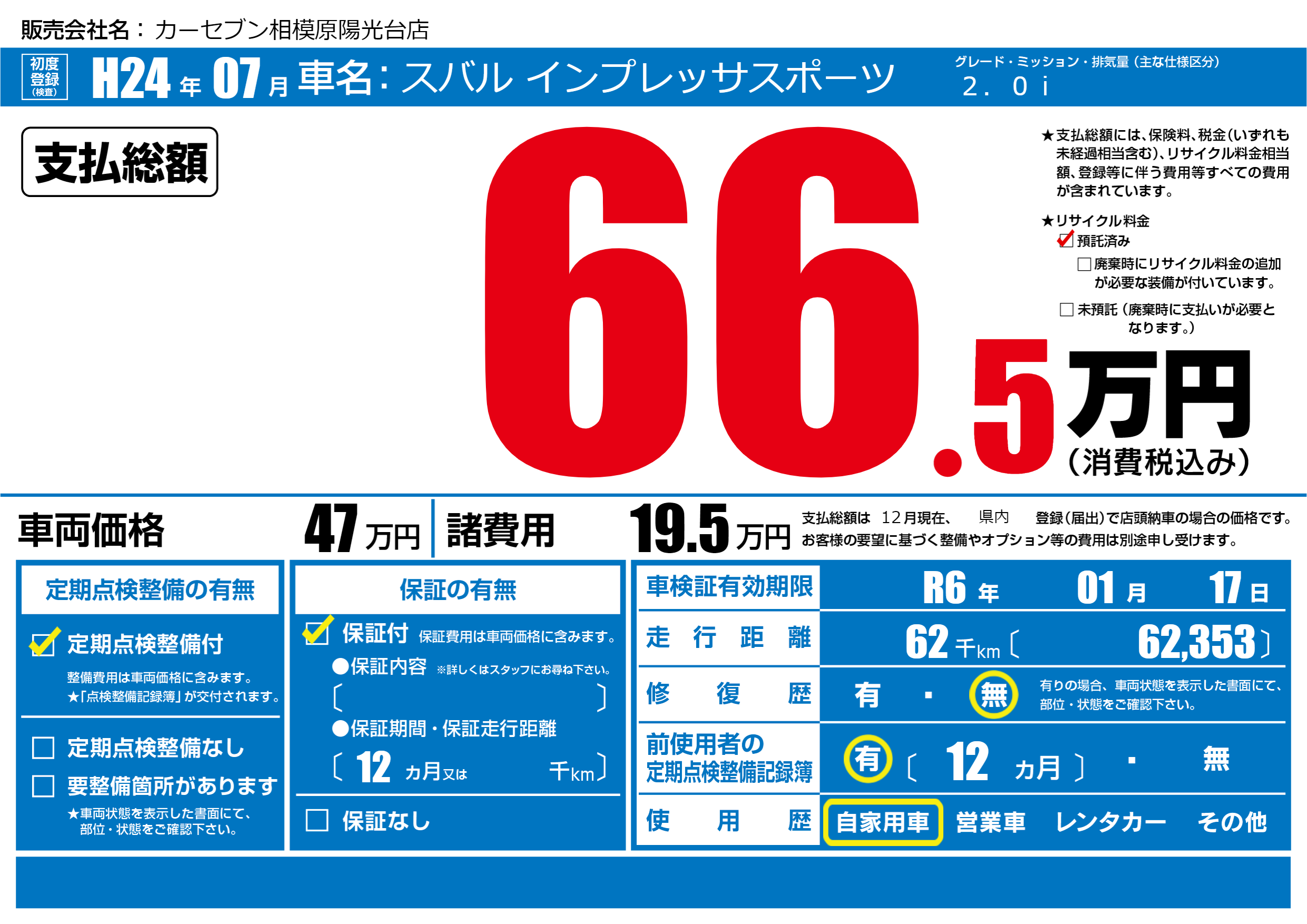 | 車名 | スバル インプレッサスポーツ | グレード ミッション 排気量 |