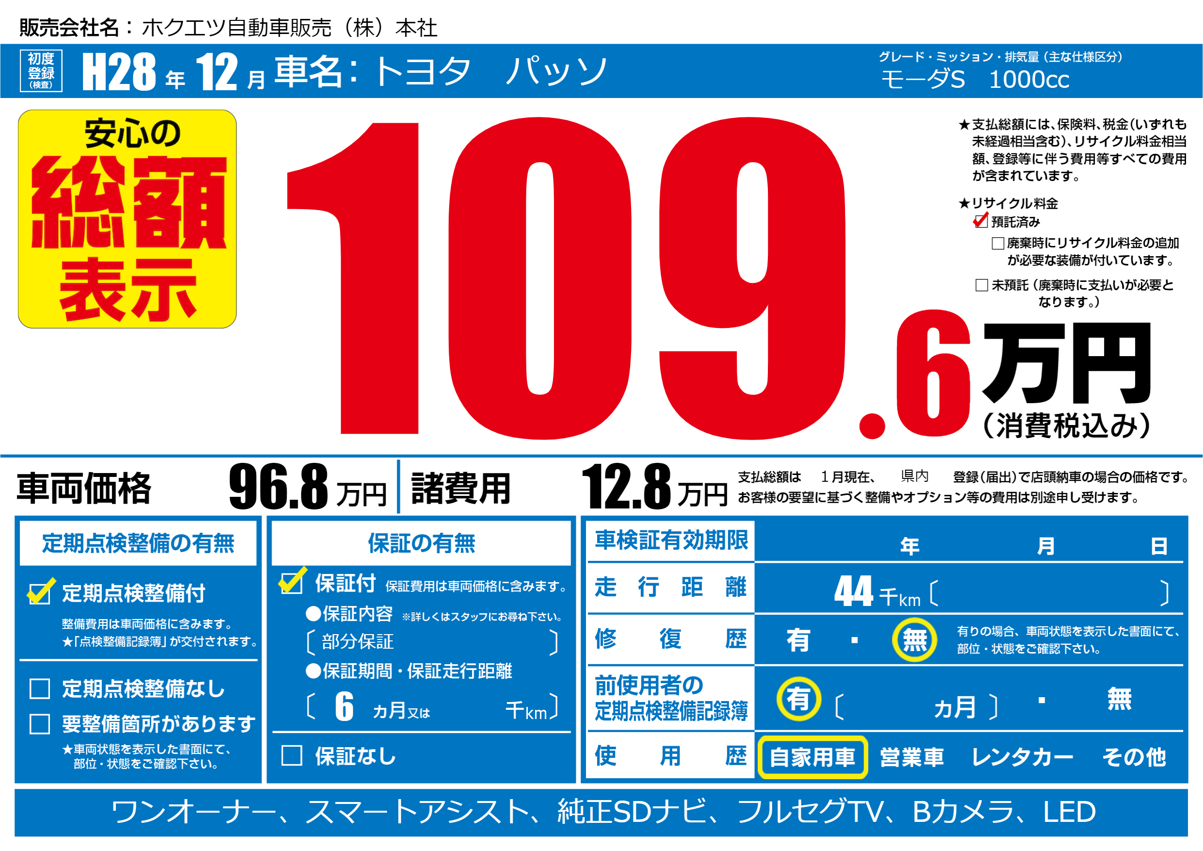 | 車名 | トヨタ パッソ | グレード ミッション 排気量 |