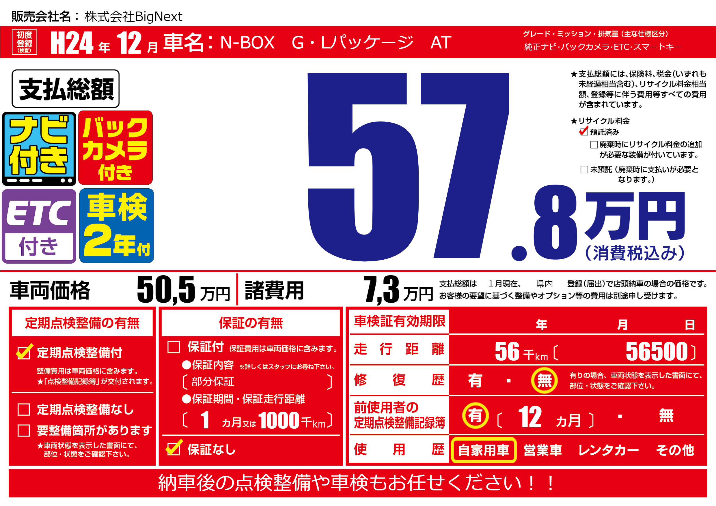 | 走行キロ | 5.6万km | 初年度登録 | H24年12月 |
