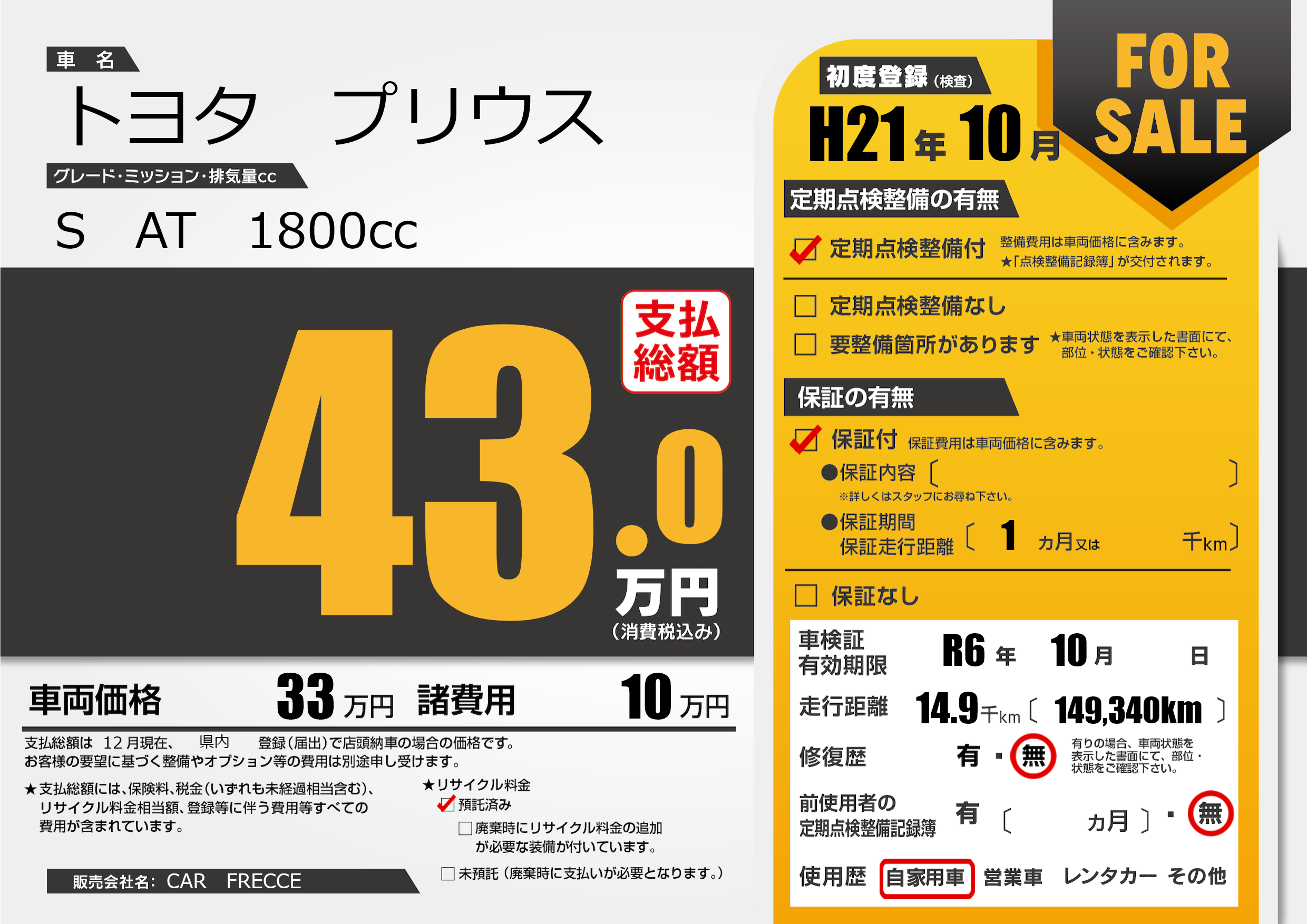 | 車名 | トヨタ プリウス | グレード ミッション 排気量 |
