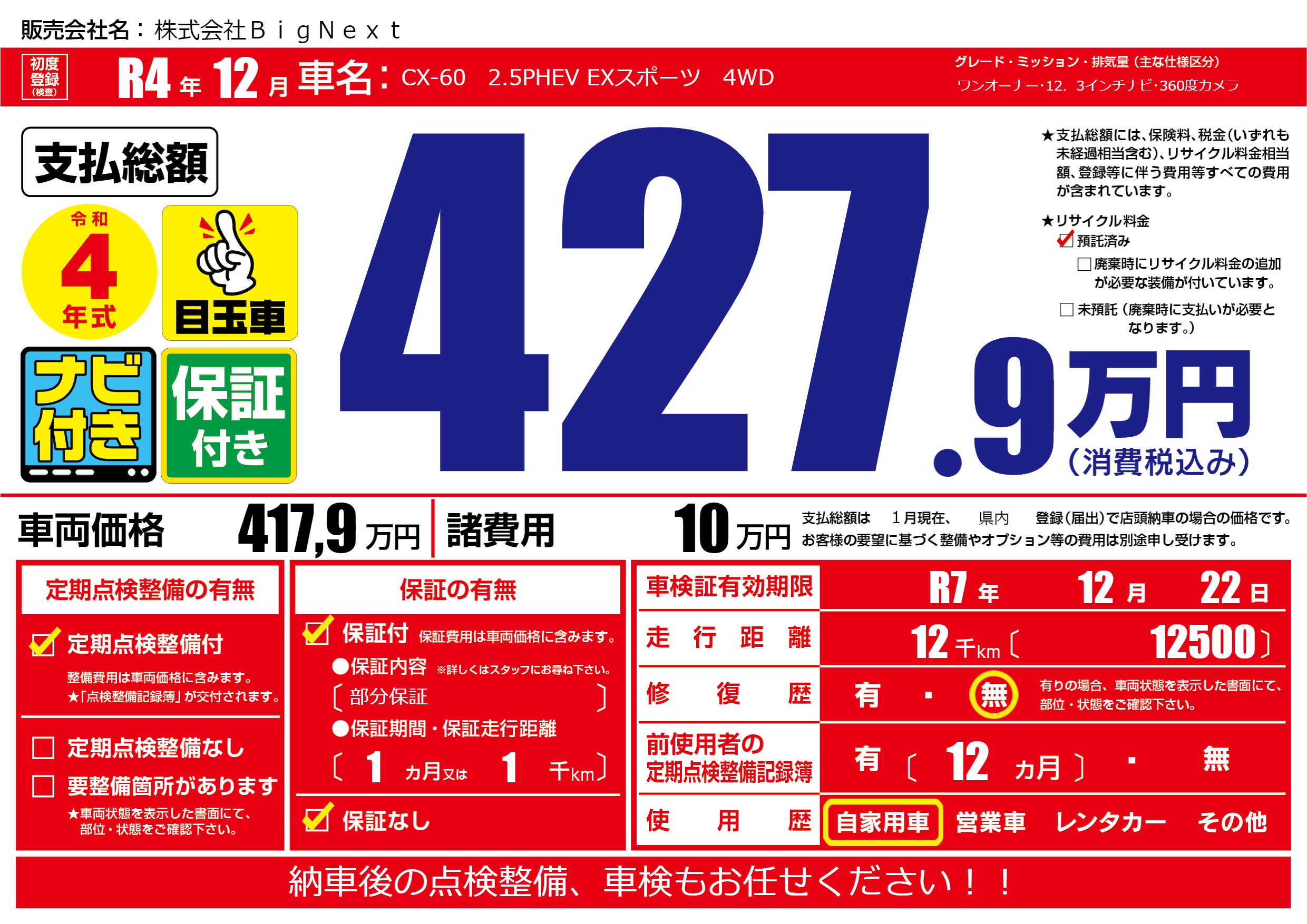 | 車名 | CX-60 2.5PHEV EXスポーツ 4WD | グレード ミッション 排気量 |