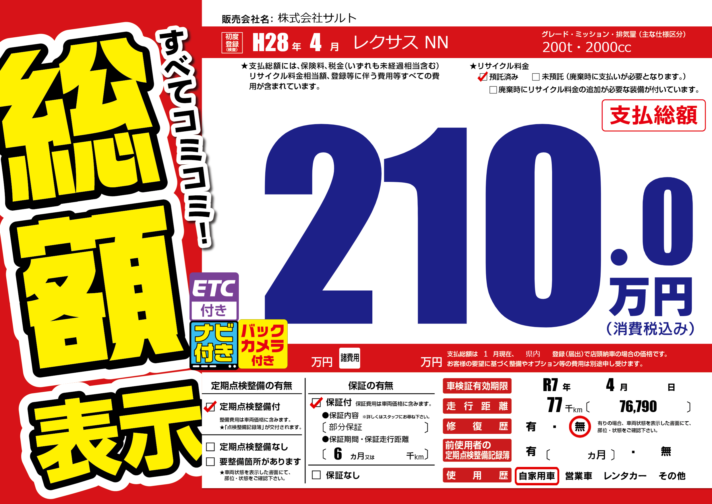 | 走行キロ | 7.7万km | 初年度登録 | H28年4月 |