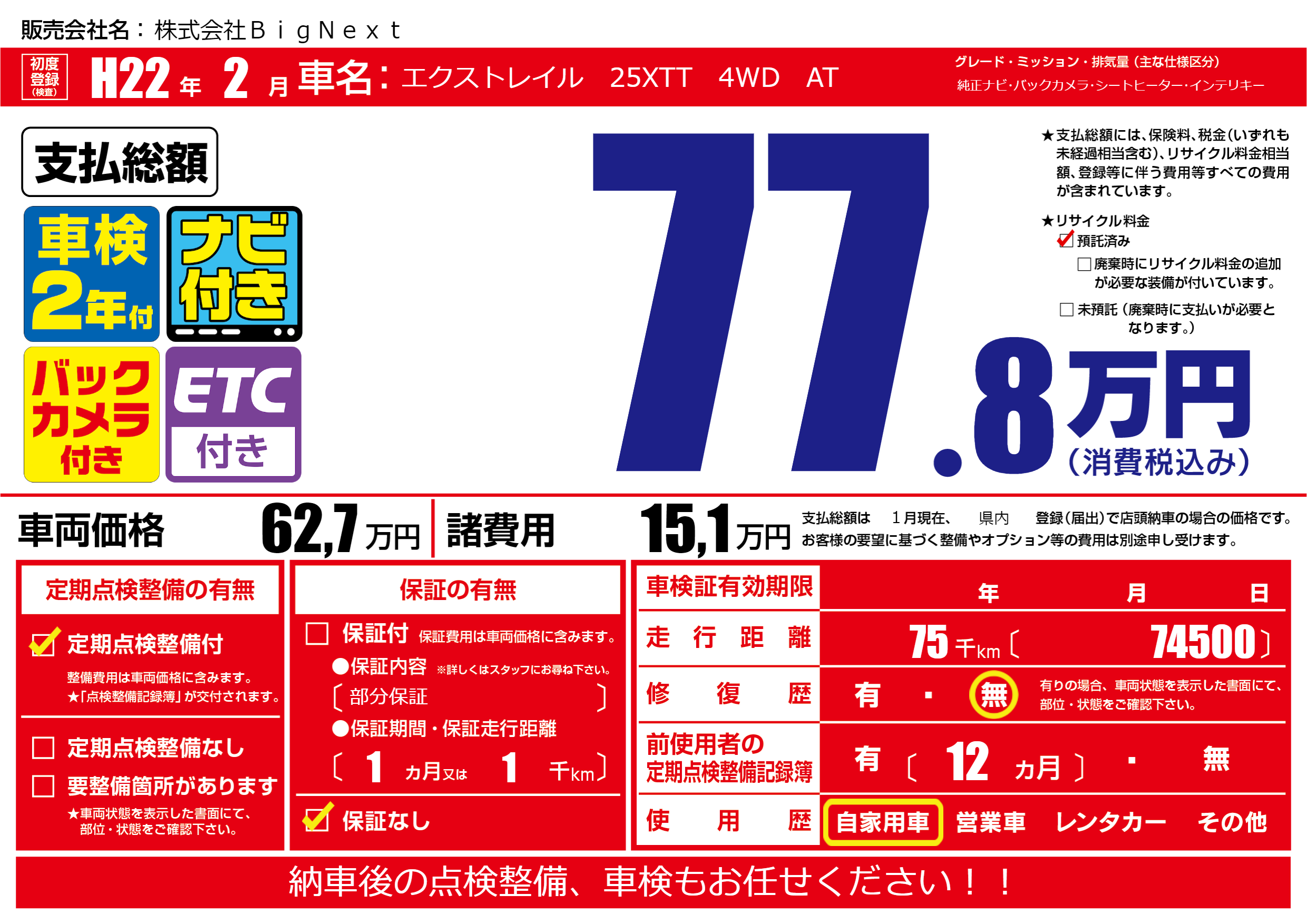 | 走行キロ | 7.5万km | 初年度登録 | H22年2月 |