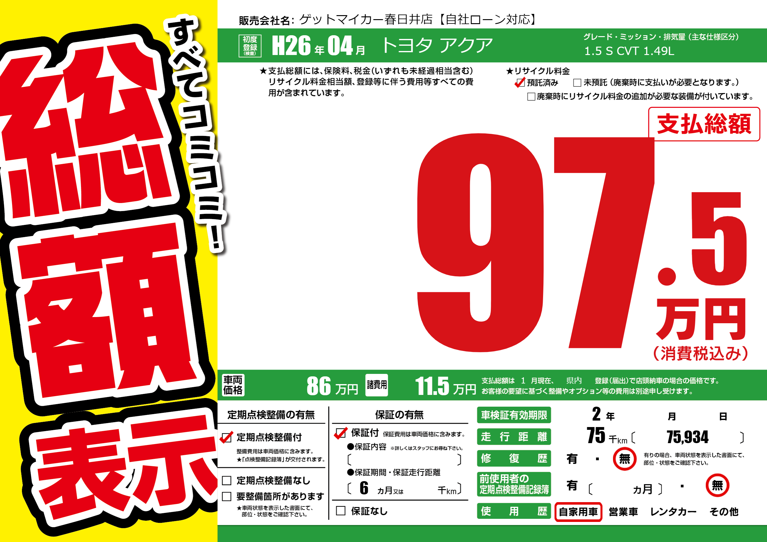 | 車名 | トヨタ アクア | グレード ミッション 排気量 |