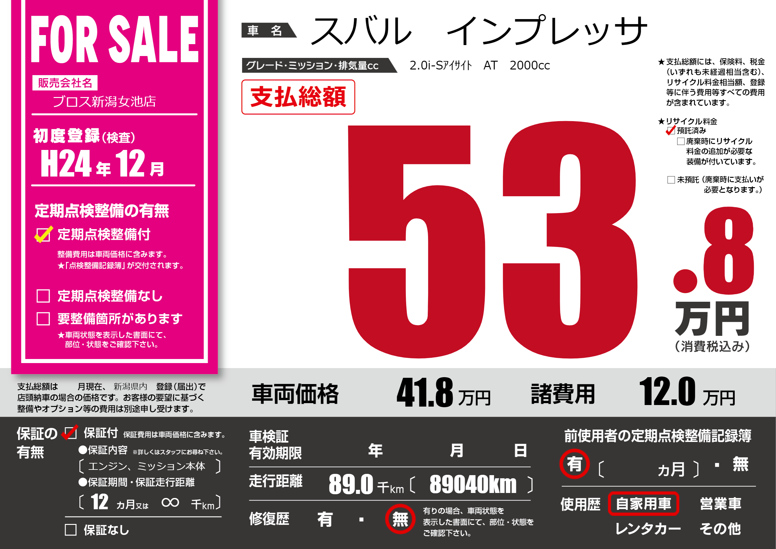 | 車名 | スバル インプレッサ | グレード ミッション 排気量 |