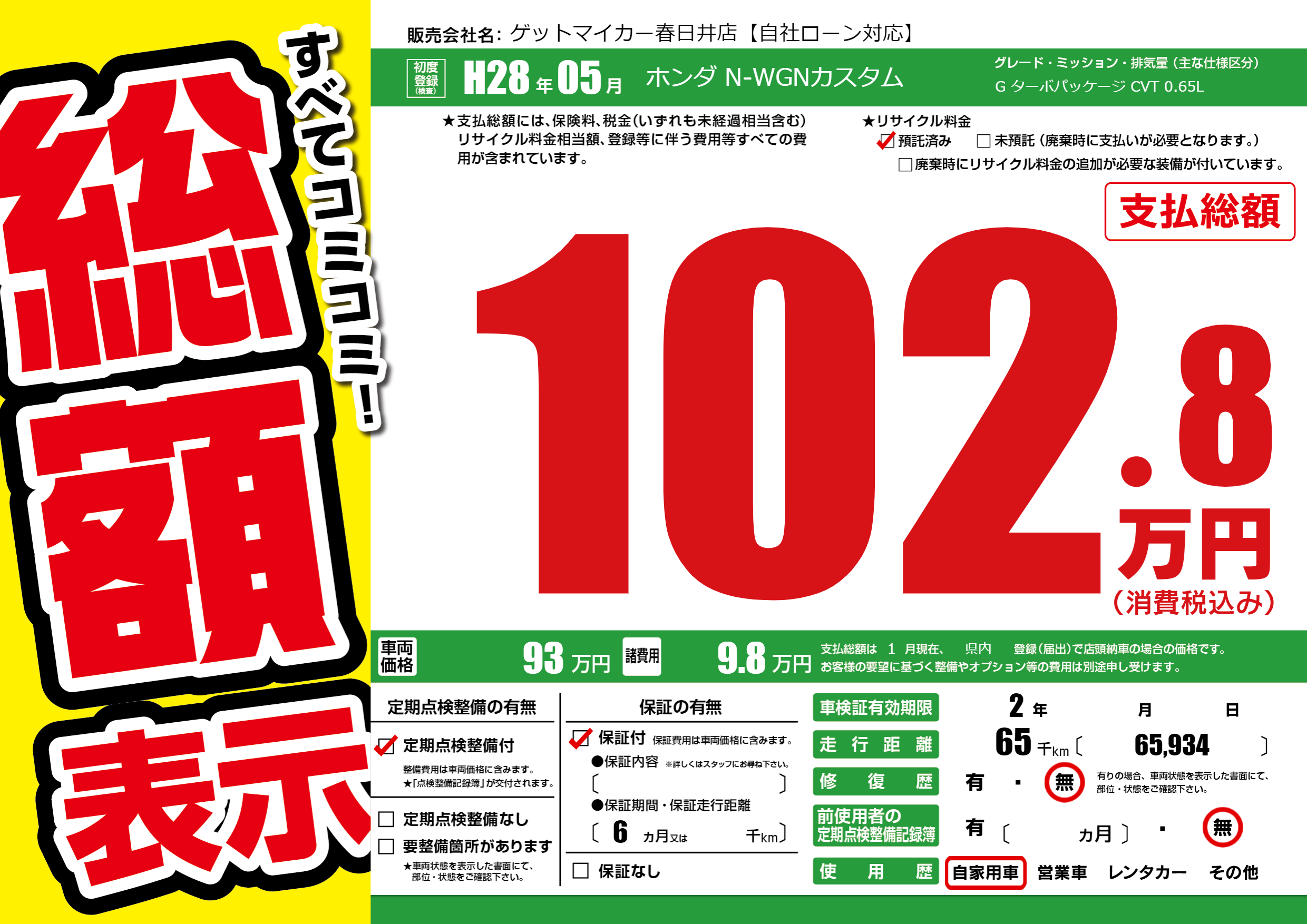 | 車名 | ホンダ N-WGNカスタム | グレード ミッション 排気量 |