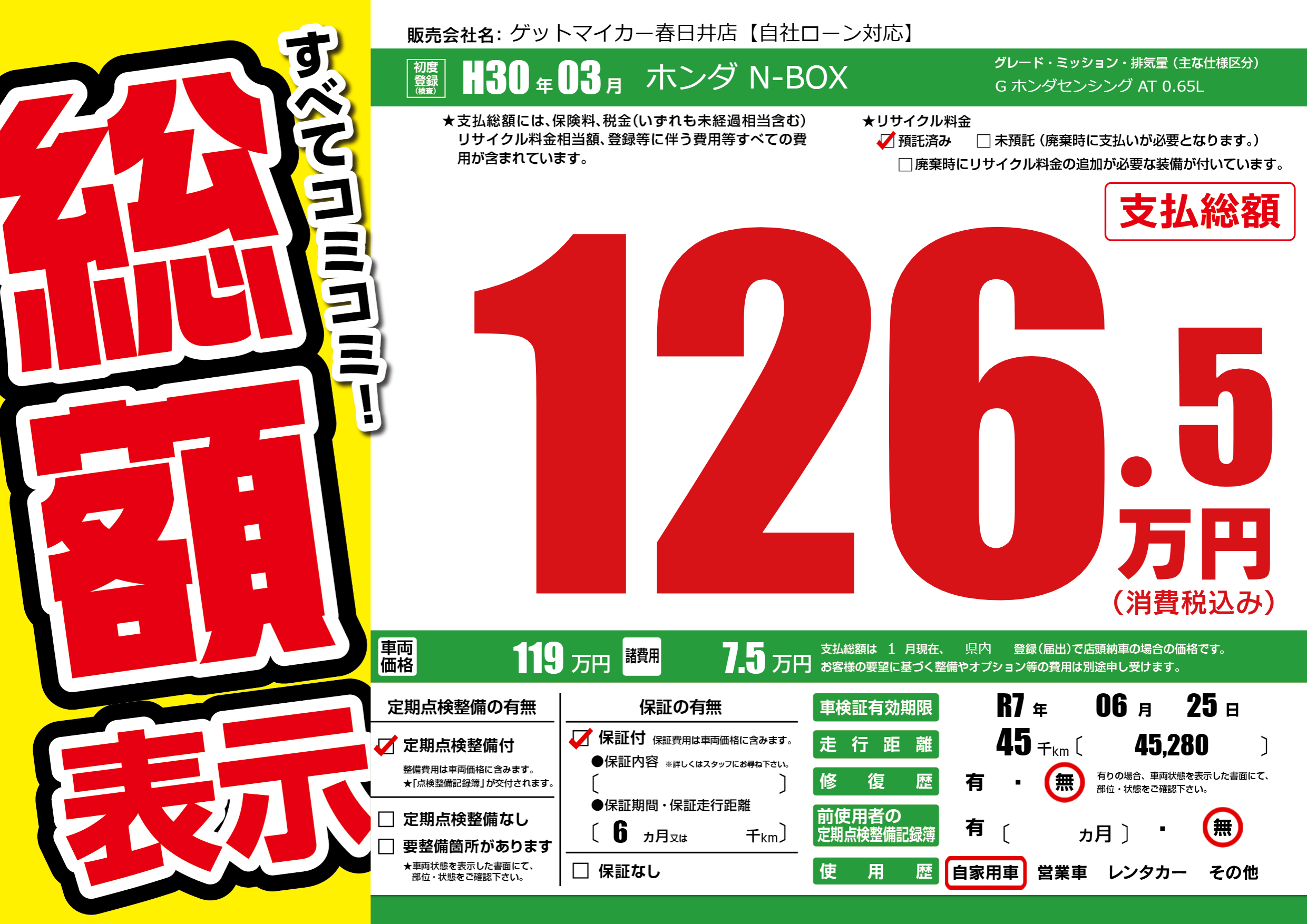 | 車名 | ホンダ N-BOX | グレード ミッション 排気量 |