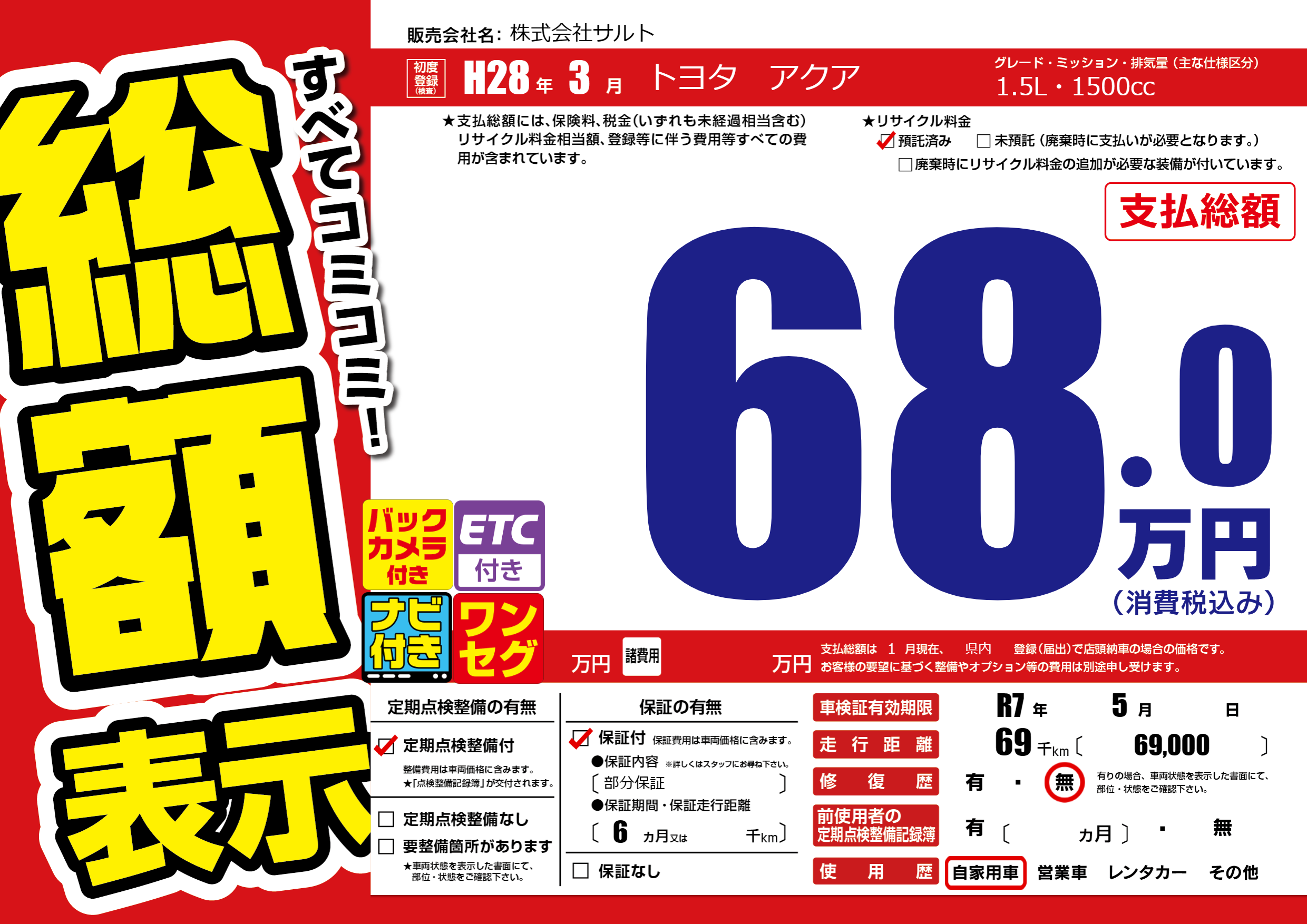 | 車名 | トヨタ アクア | グレード ミッション 排気量 |