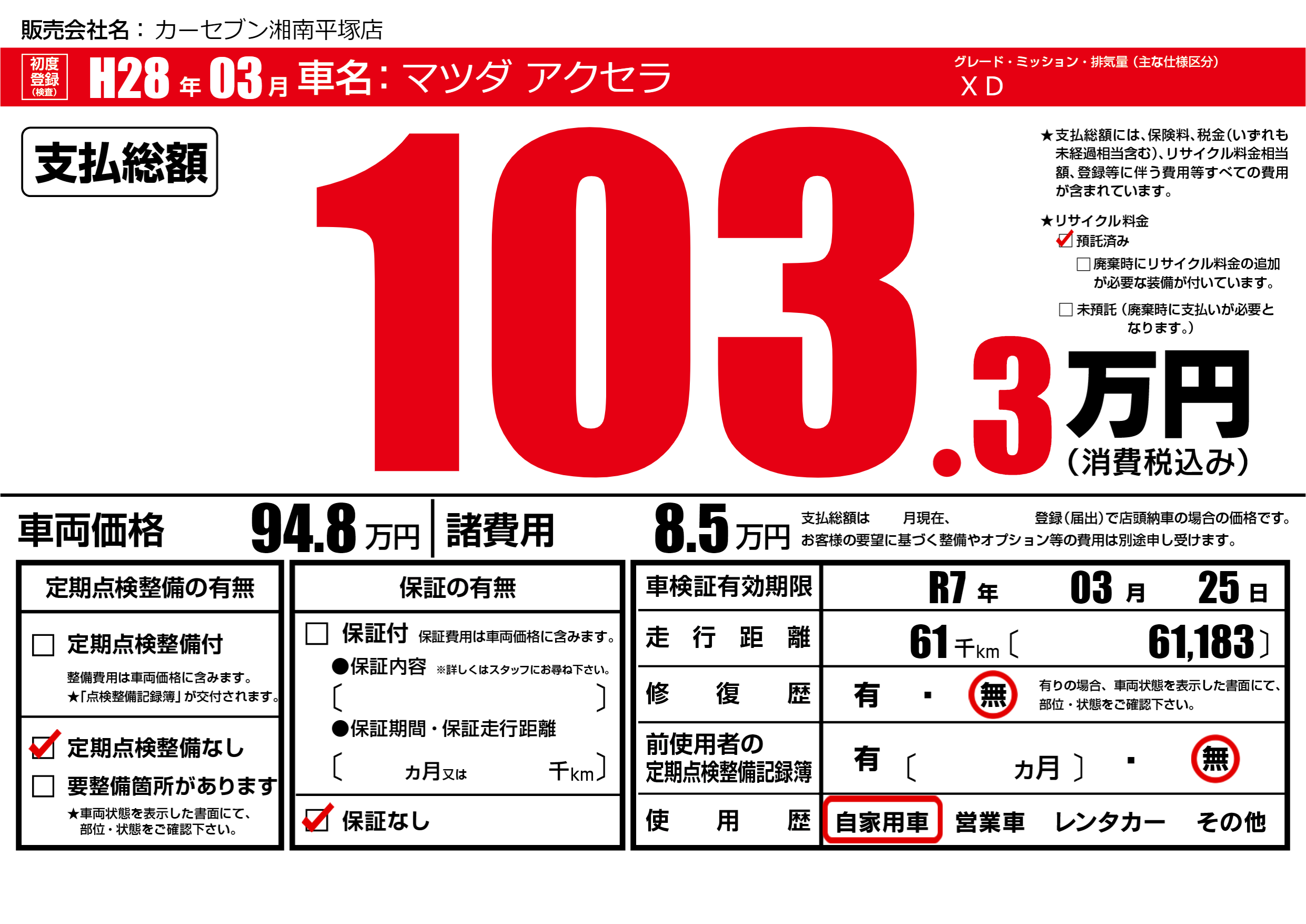 | 走行キロ | 6.1万km | 初年度登録 | H28年03月 |