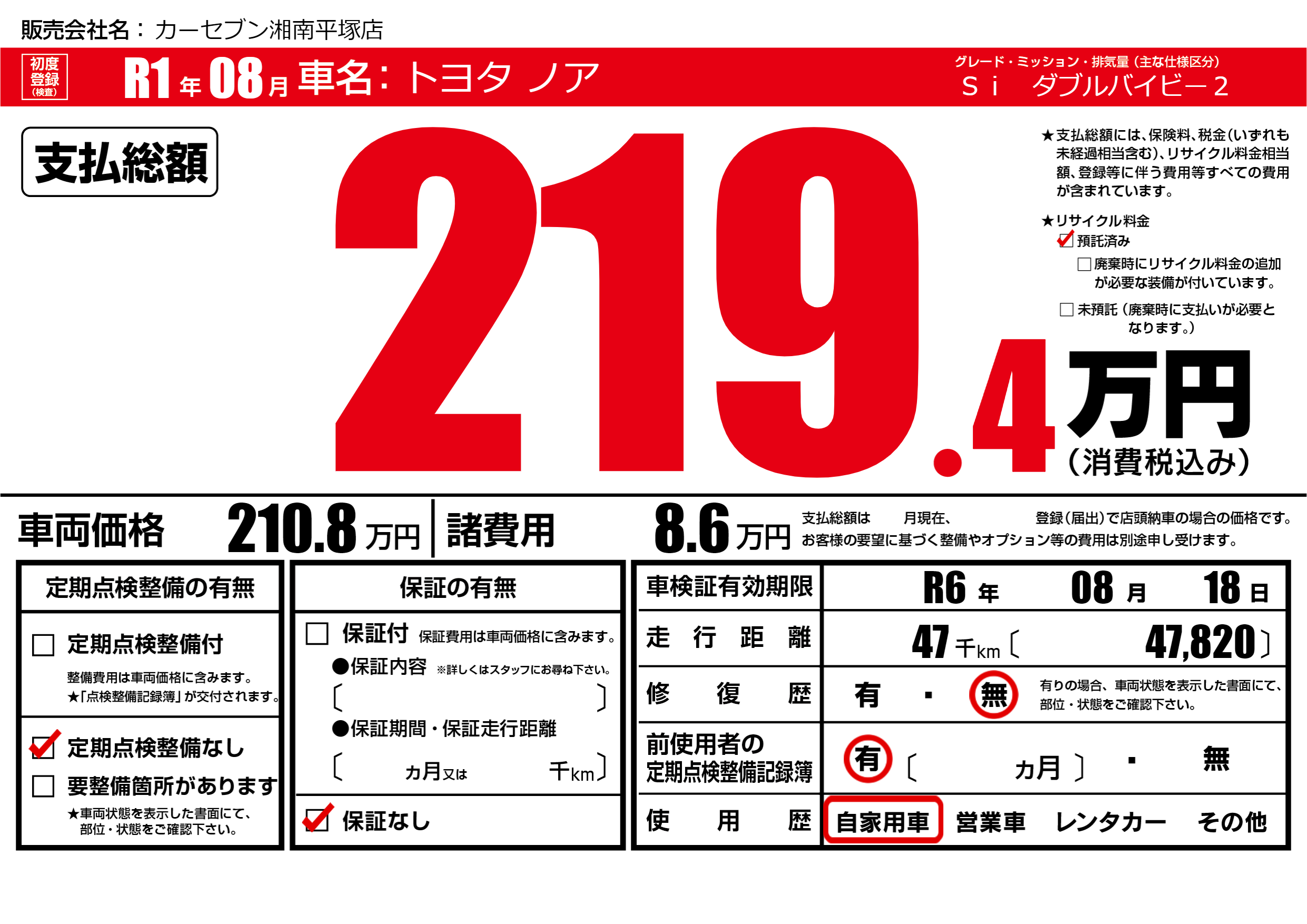| 走行キロ | 4.7万km | 初年度登録 | R1年08月 |