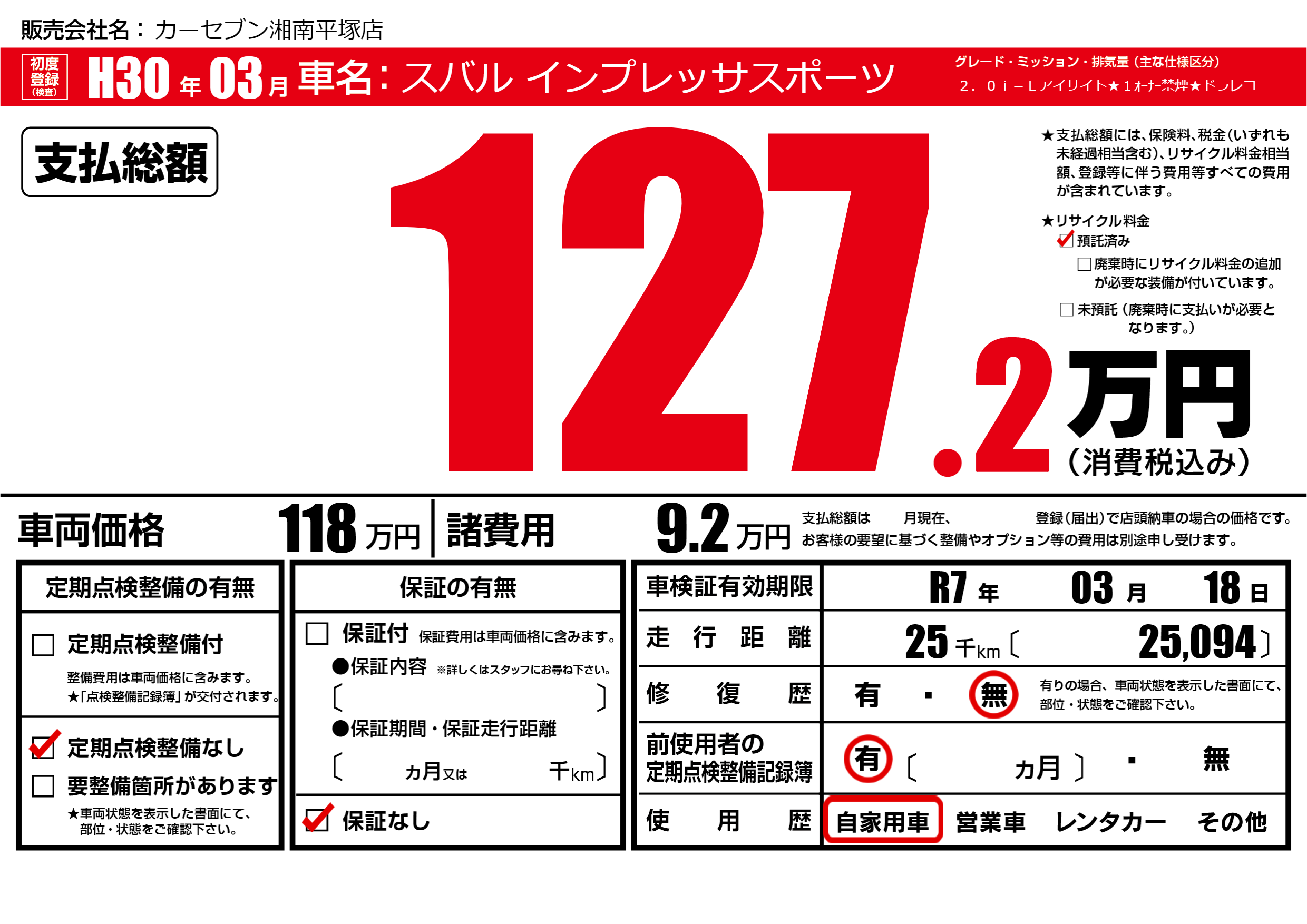 | 車名 | スバル インプレッサスポーツ | グレード ミッション 排気量 |