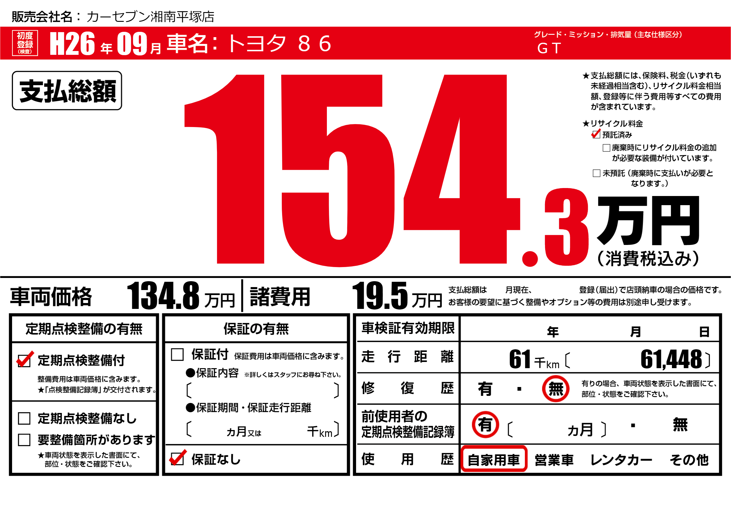 | 車名 | トヨタ 86 | グレード ミッション 排気量 |