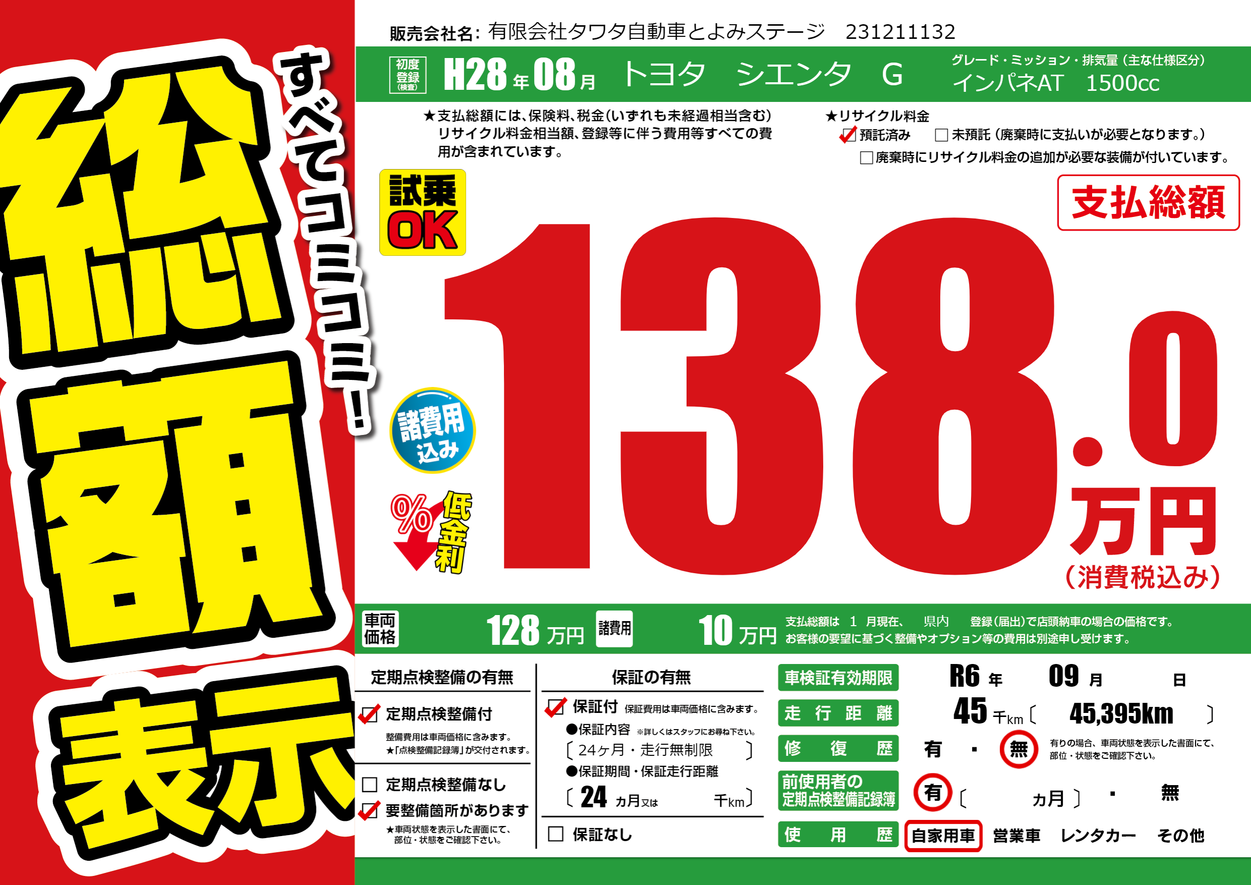 | 車名 | トヨタ シエンタ G | グレード ミッション 排気量 |