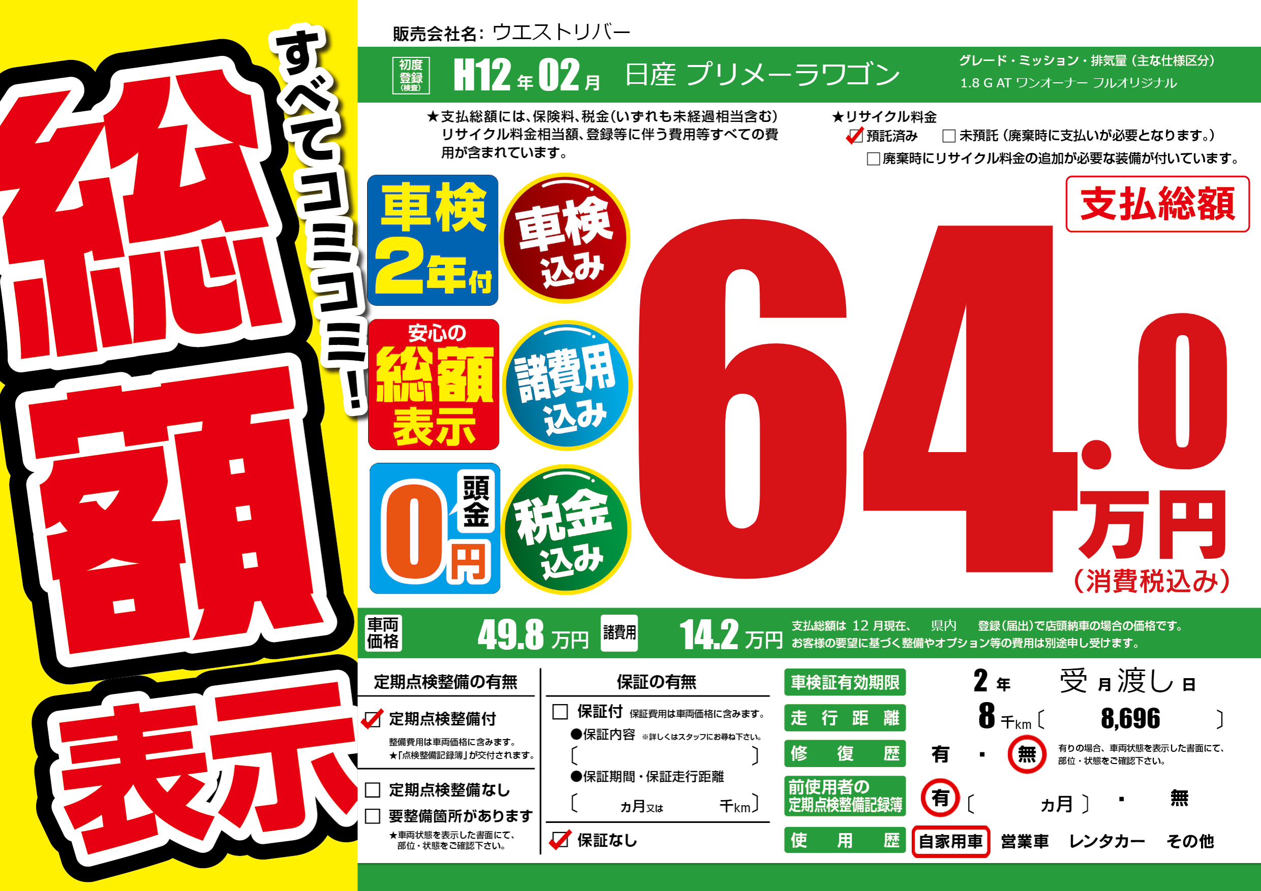 | 車名 | 日産 プリメーラワゴン | グレード ミッション 排気量 |