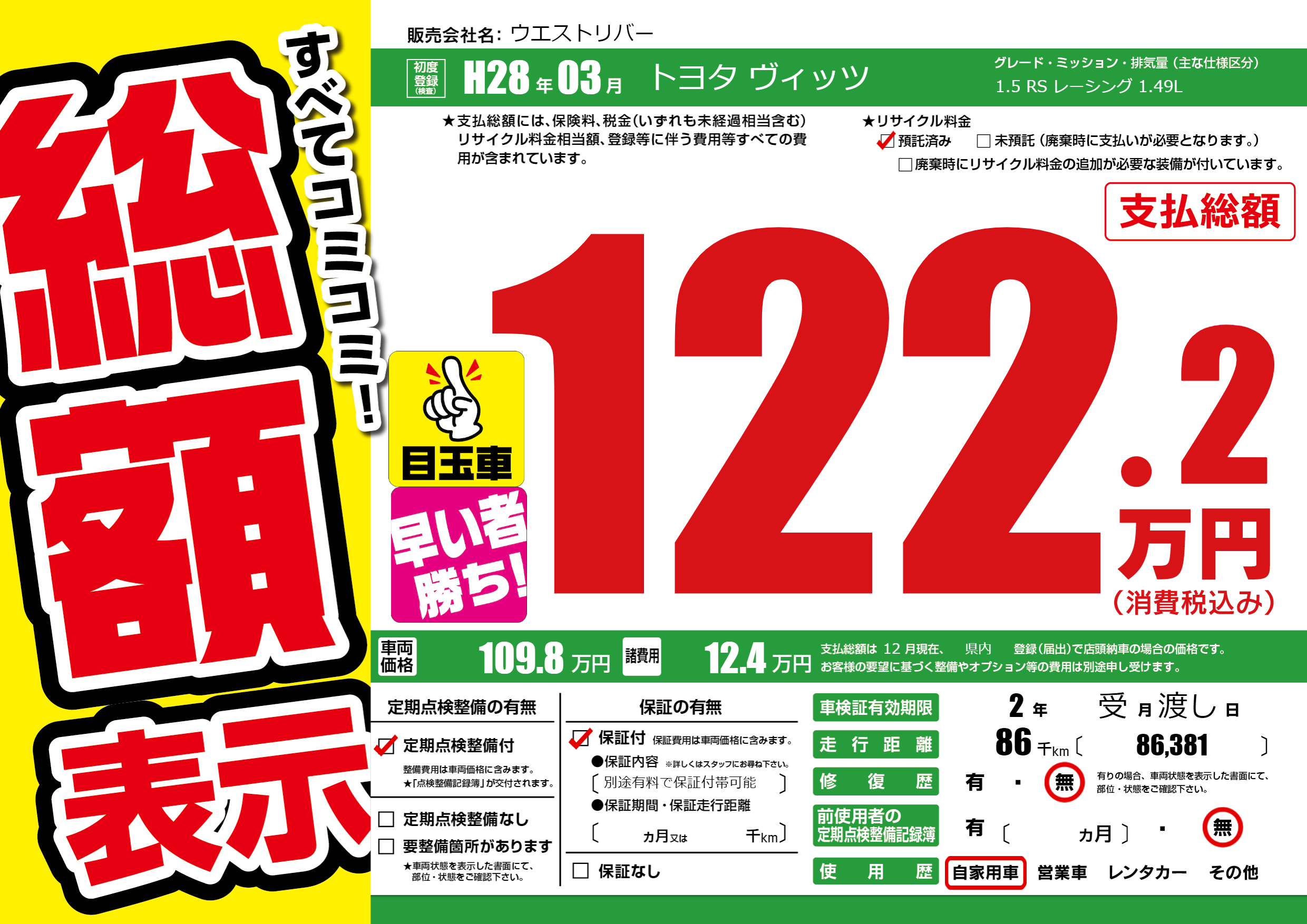 | 車名 | トヨタ ヴィッツ | グレード ミッション 排気量 |