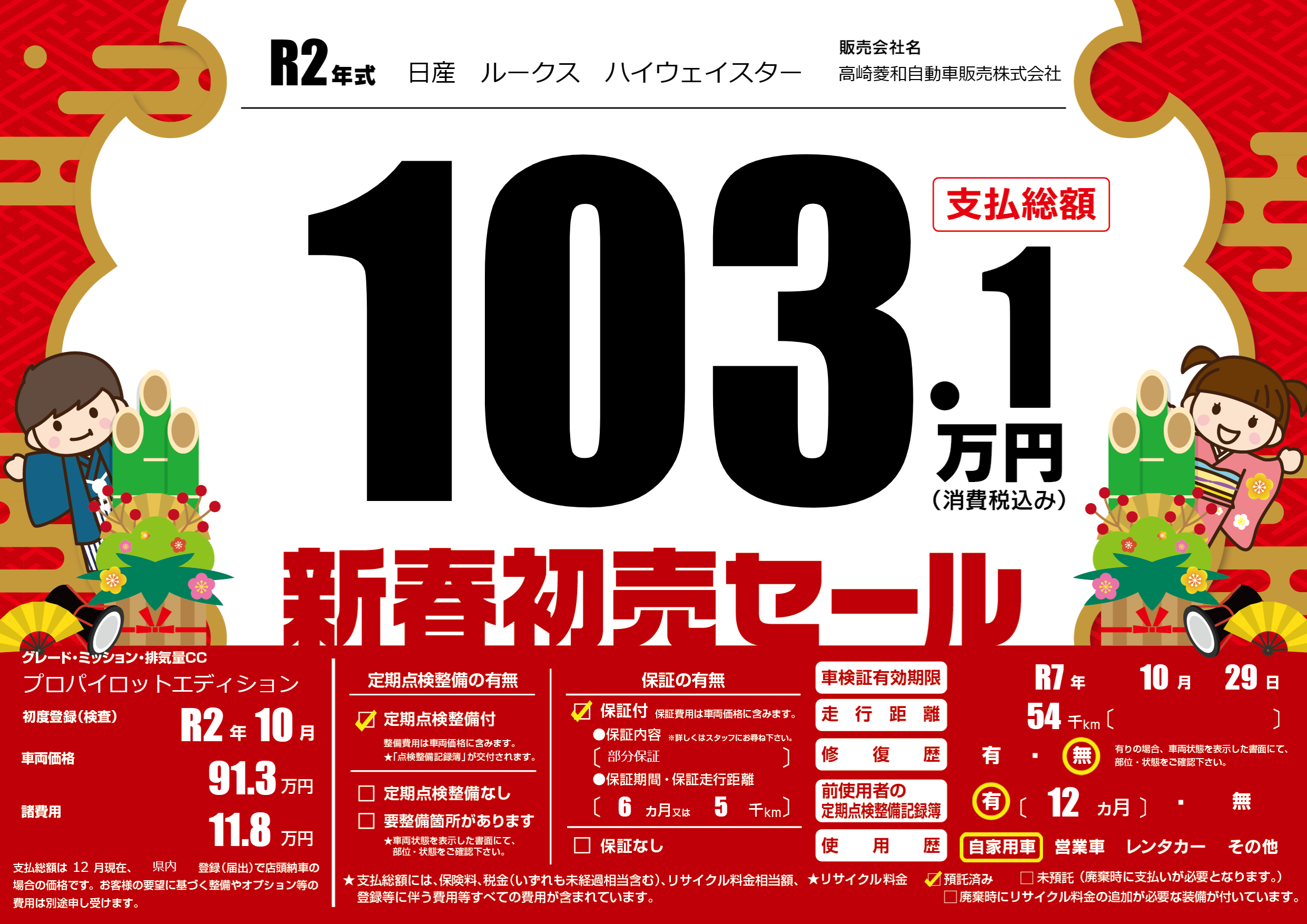 | 車名 | 日産 ルークス ハイウェイスター | グレード ミッション 排気量 |