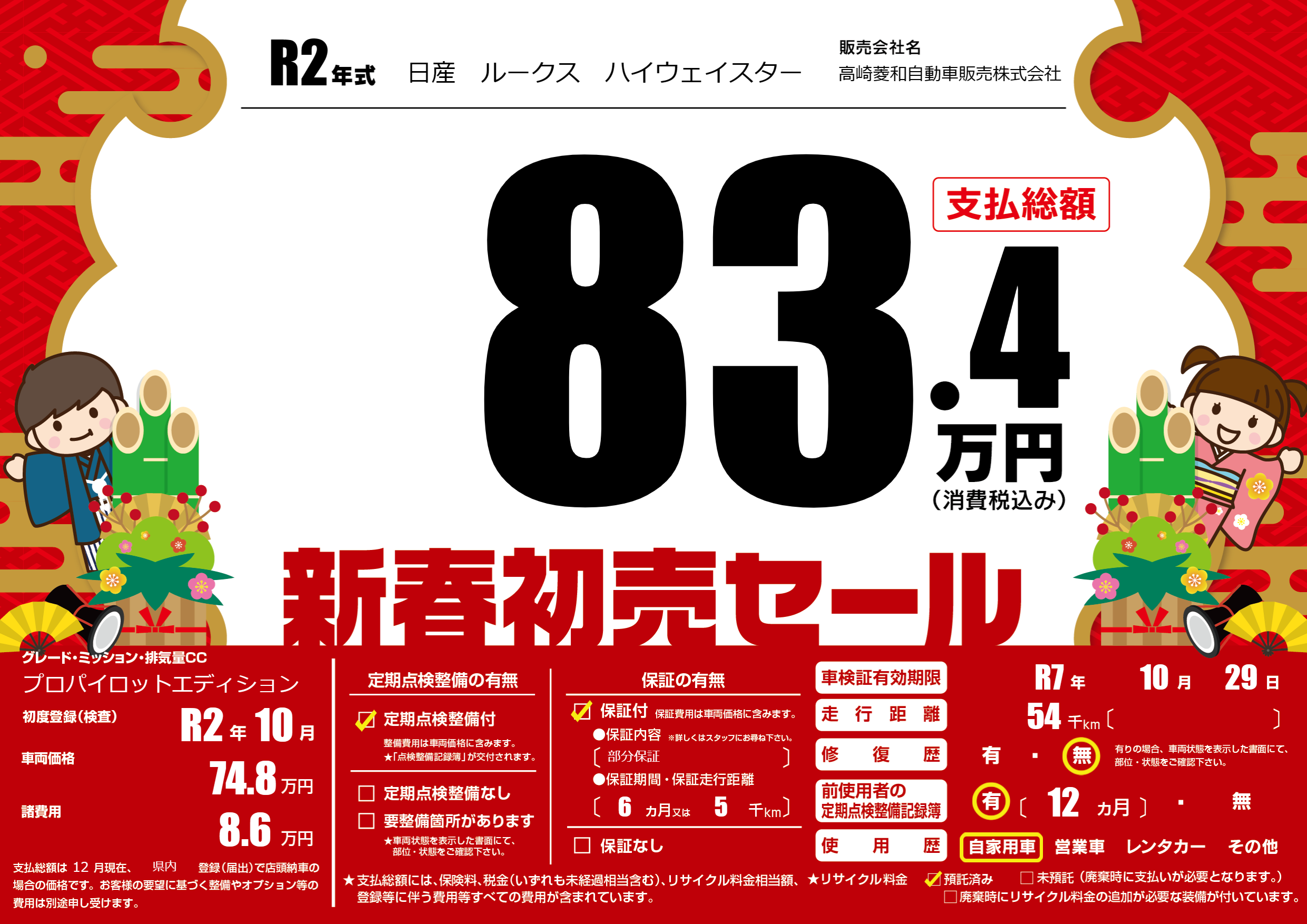 | 車名 | 日産 ルークス ハイウェイスター | グレード ミッション 排気量 |