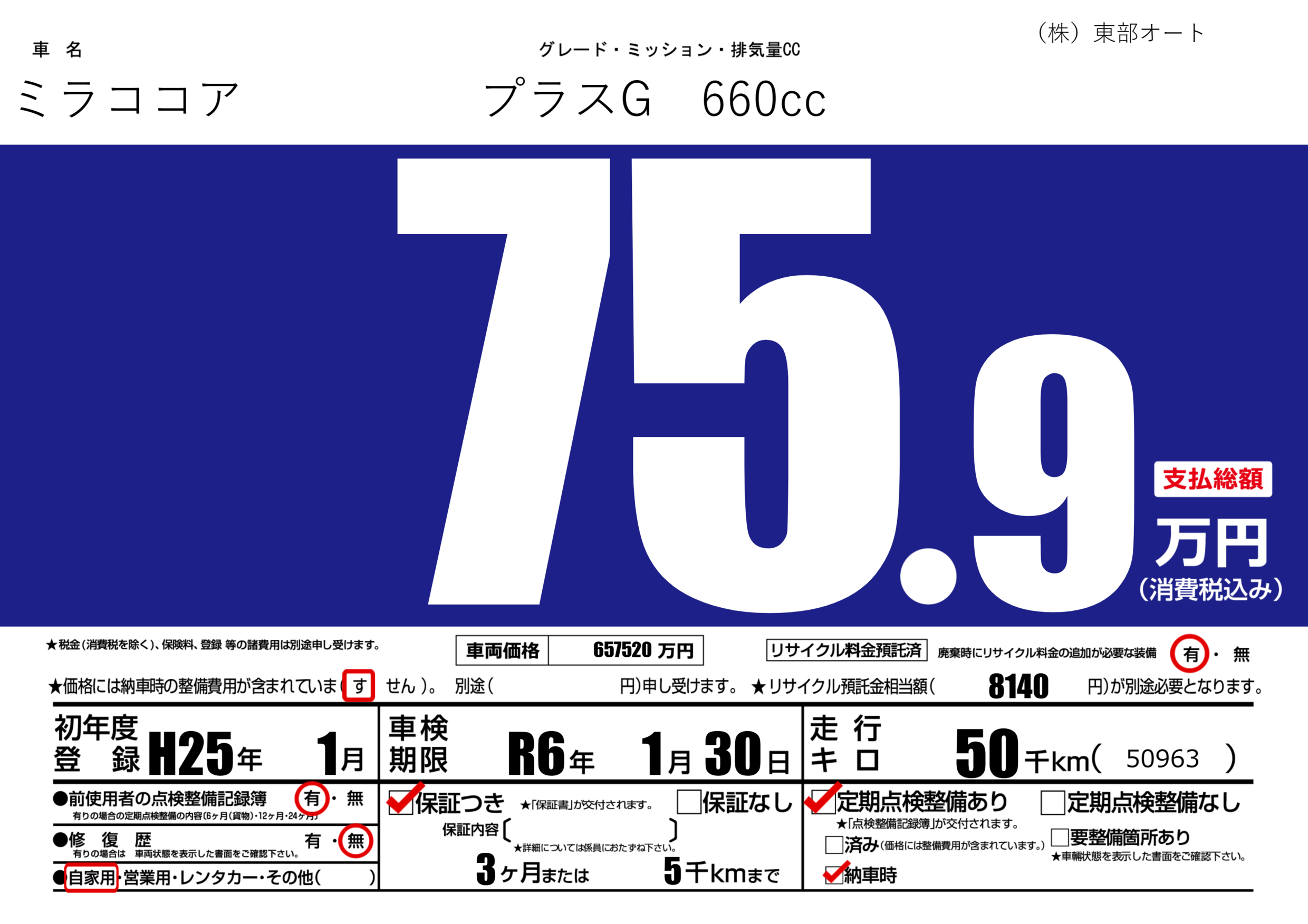 | 走行キロ | 5万km | 初年度登録 | H25年1月 |