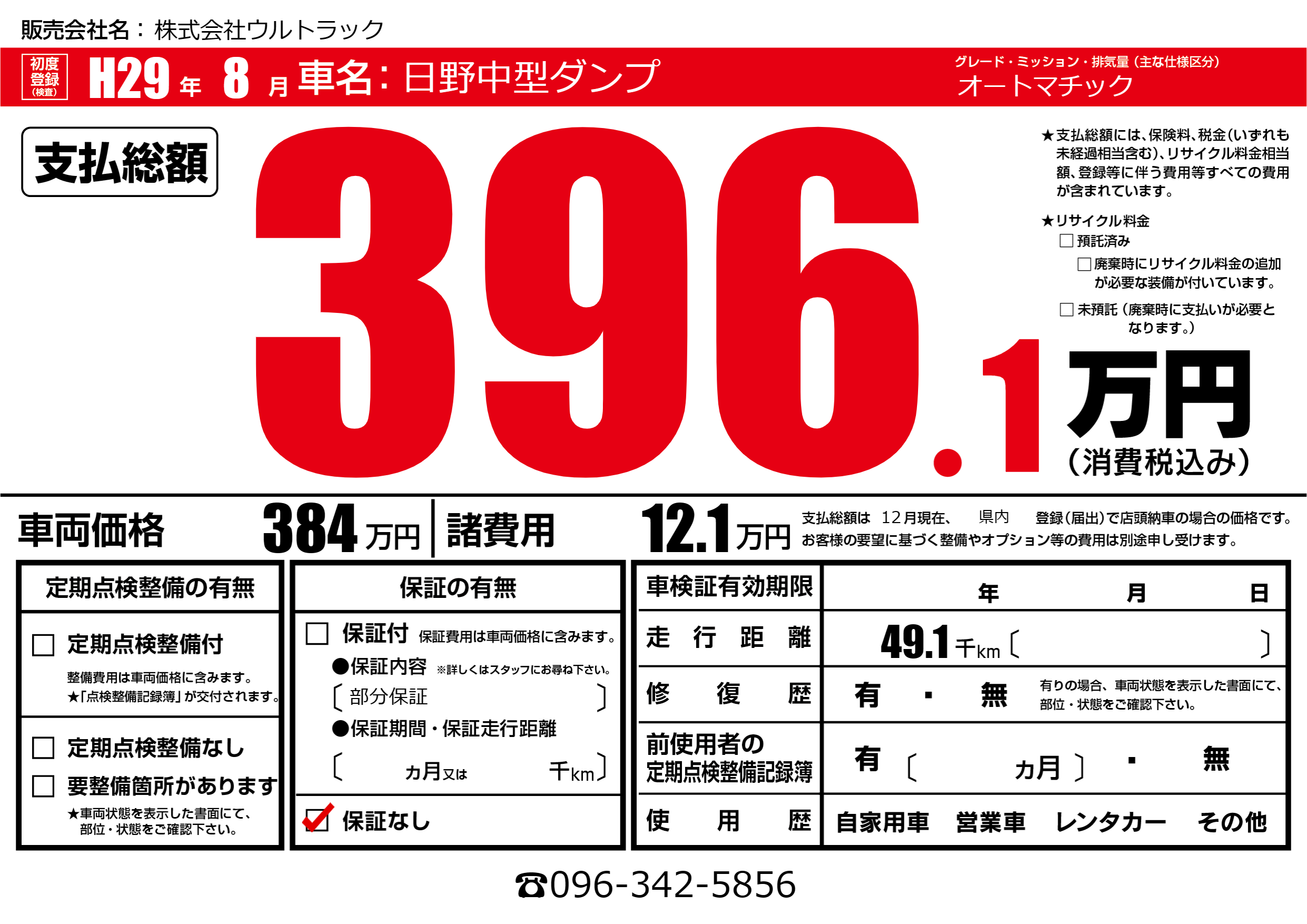 | 車名 | 日野中型ダンプ | グレード ミッション 排気量 |