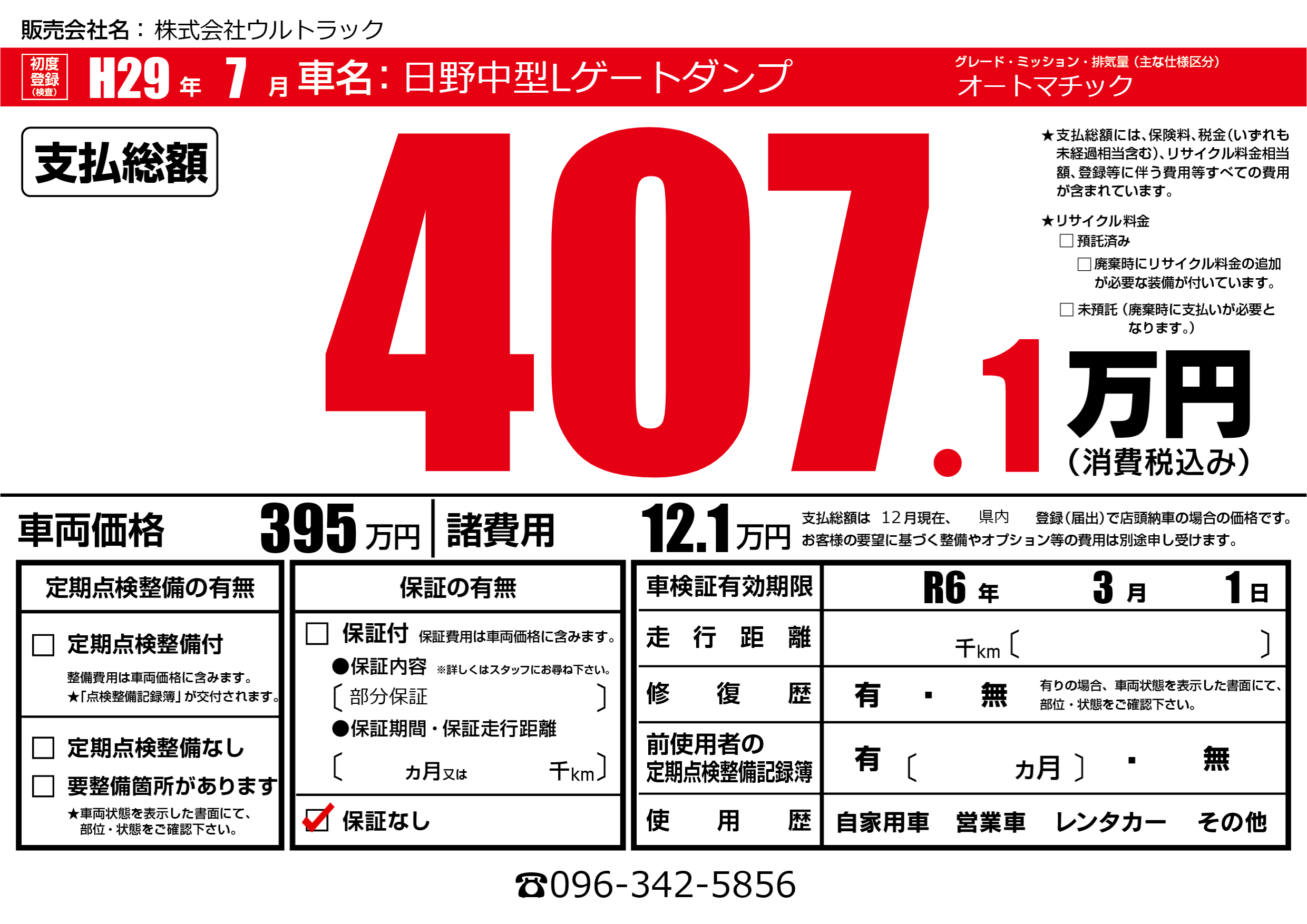 | 車名 | 日野中型Lゲートダンプ | グレード ミッション 排気量 |