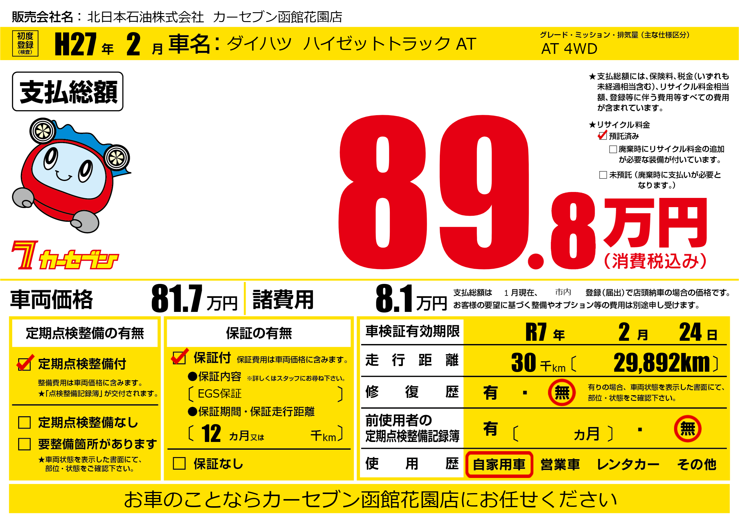 | 車名 | ダイハツ ハイゼットトラック AT | グレード ミッション 排気量 |