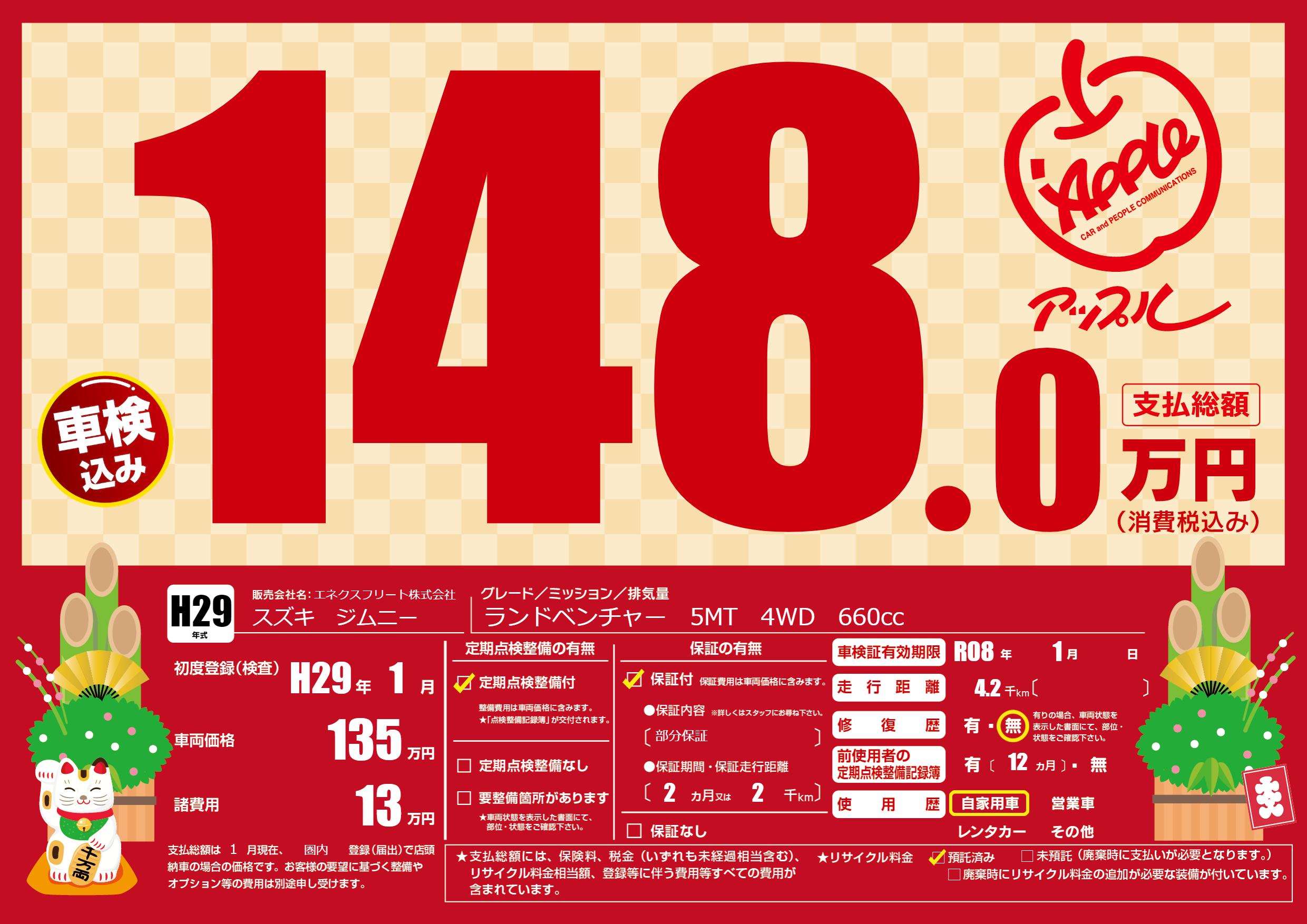 | 走行キロ | 0.4万km | 初年度登録 | H29年1月 |