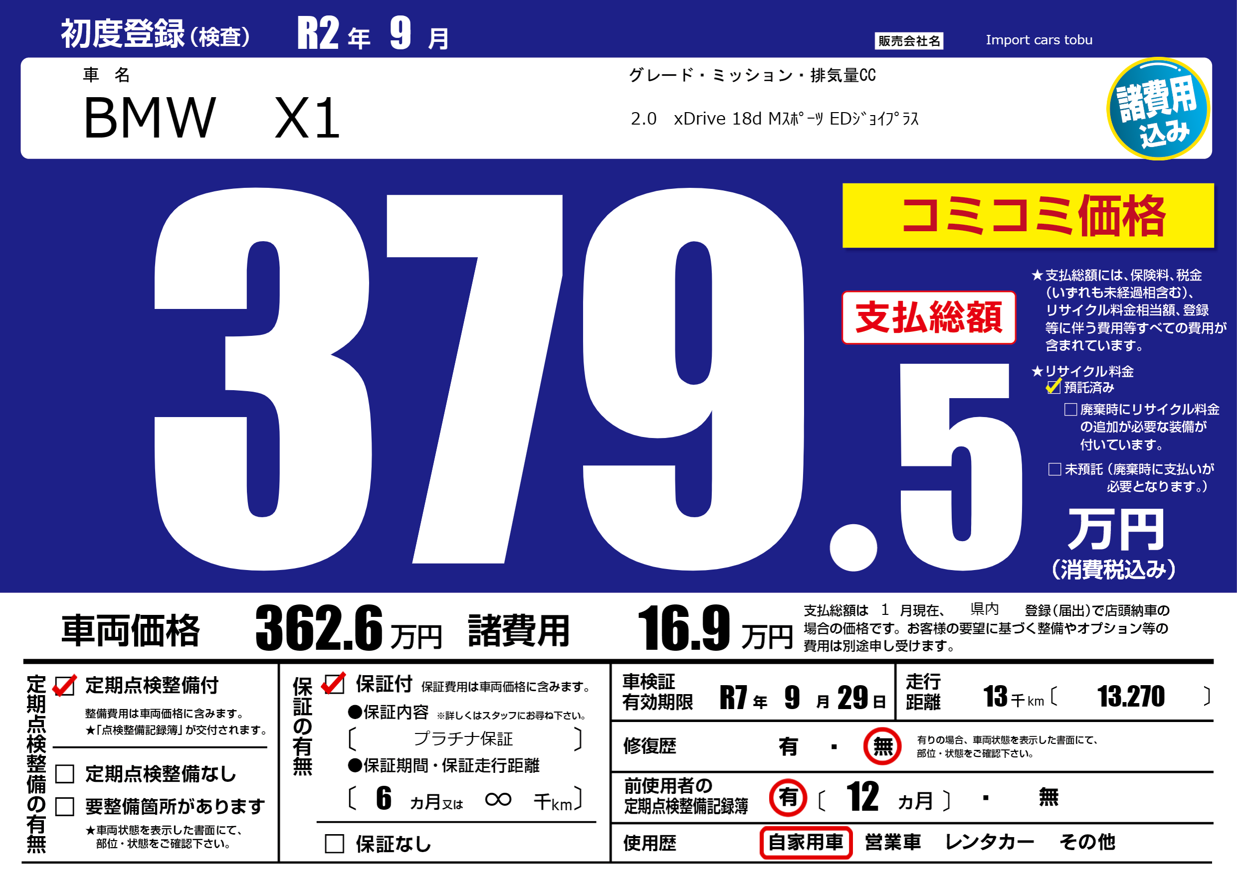 | 車名 | BMW X1 | グレード ミッション 排気量 |