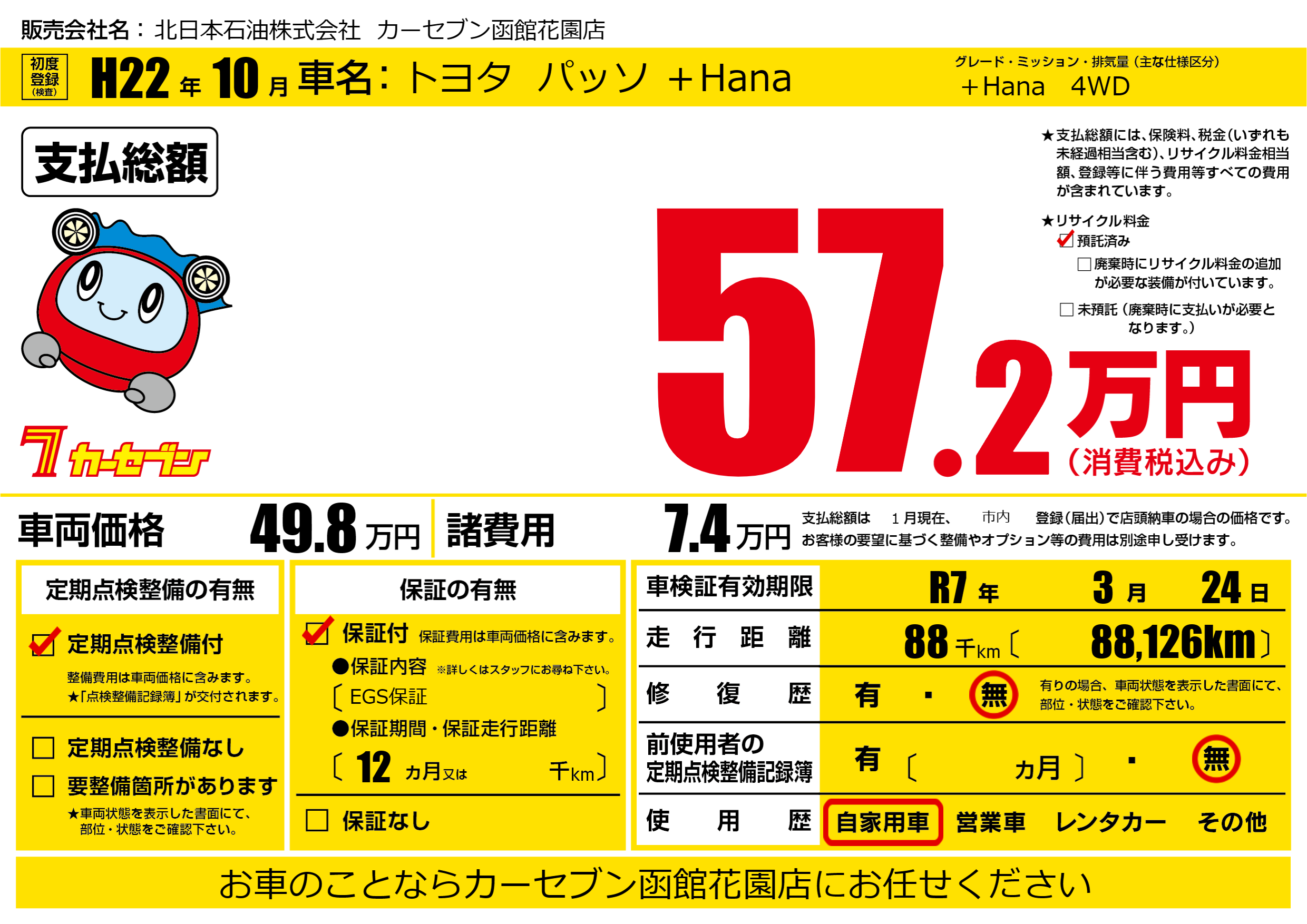 | 車名 | トヨタ パッソ +Hana | グレード ミッション 排気量 |
