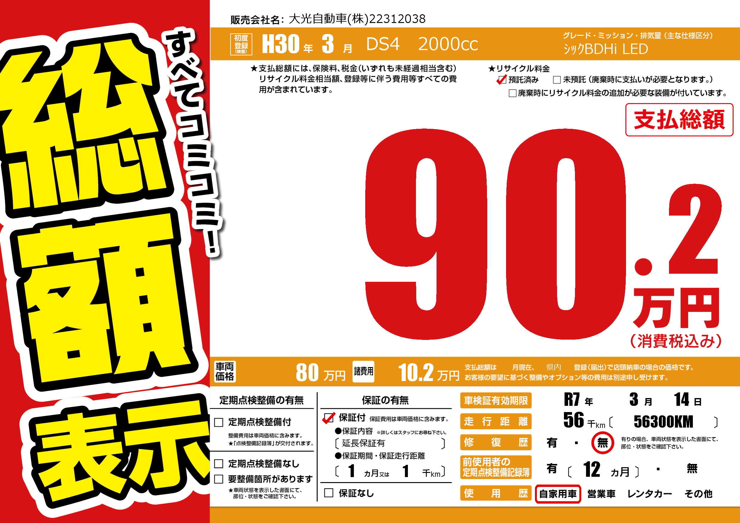 | 車名 | DS4 2000cc | グレード ミッション 排気量 |