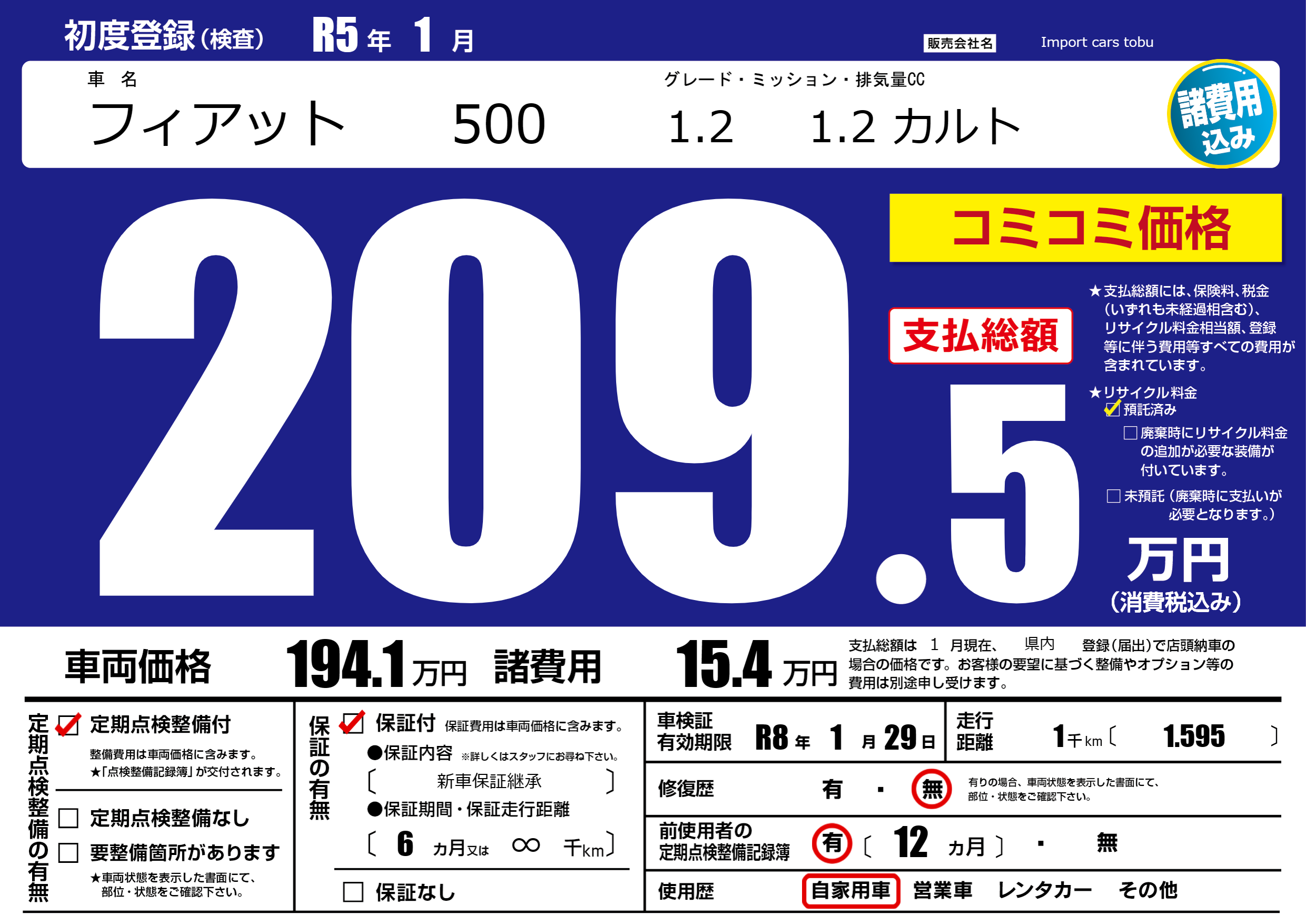 | 車名 | フィアット 500 | グレード ミッション 排気量 |