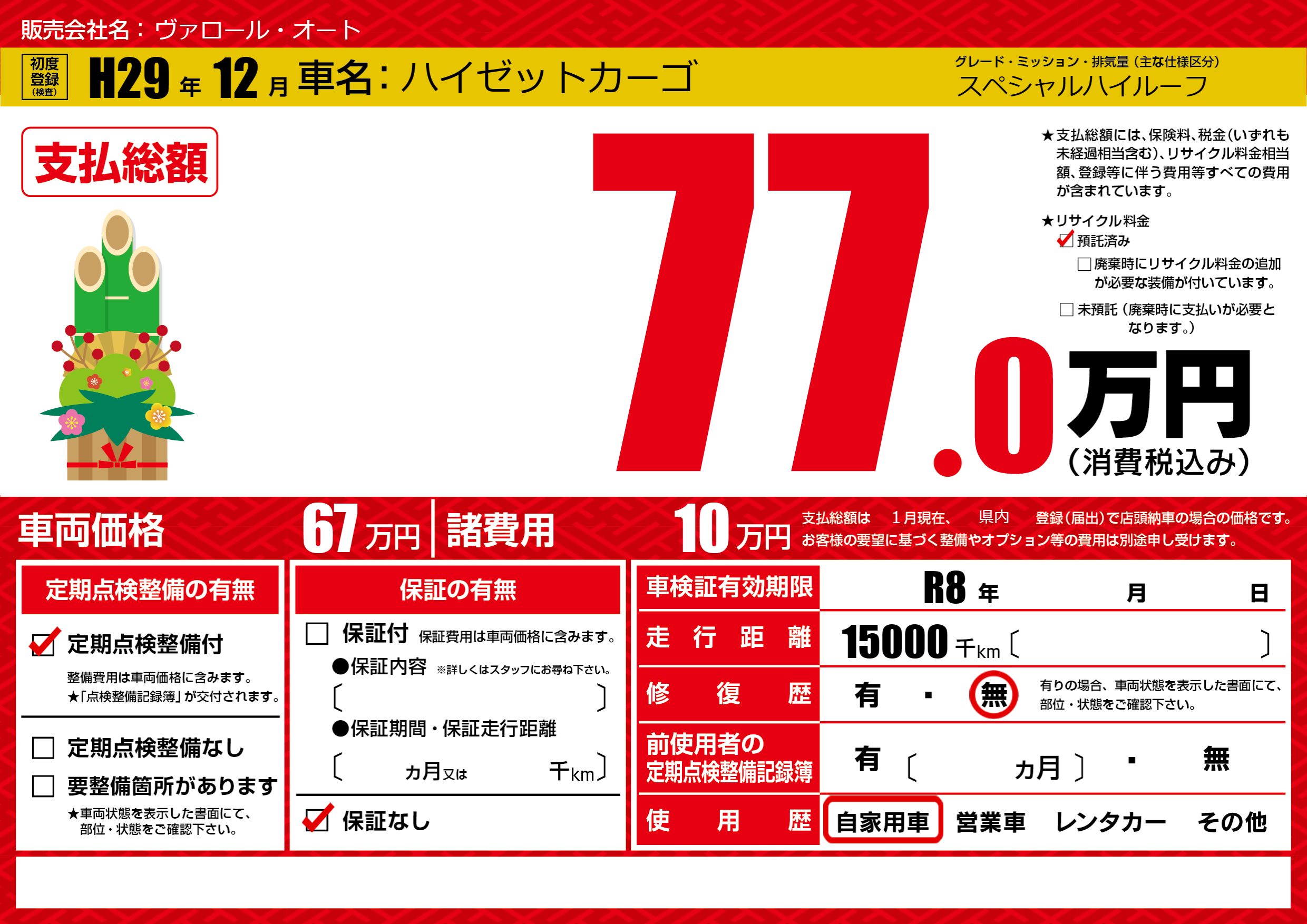 | 車名 | ハイゼットカーゴ | グレード ミッション 排気量 |