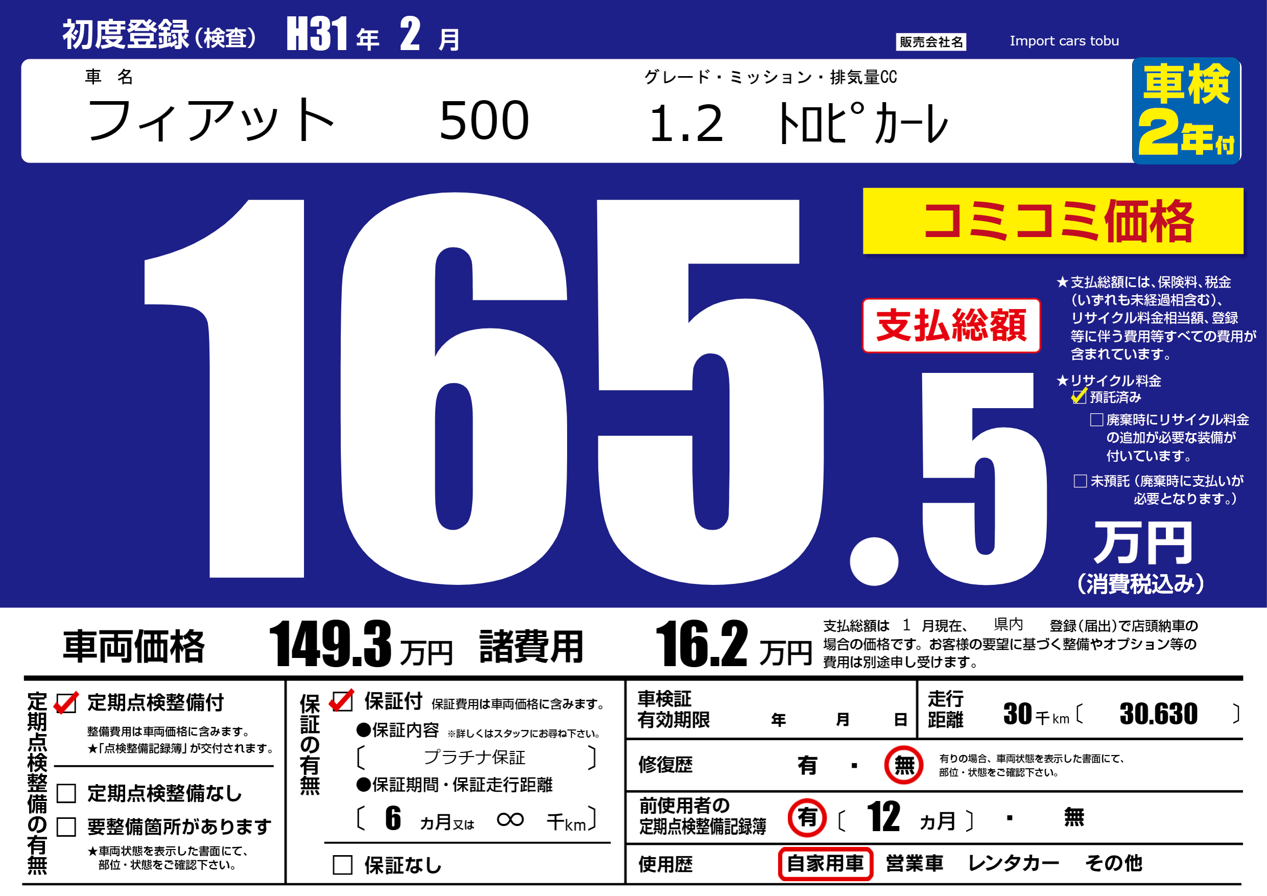 | 車名 | フィアット 500 | グレード ミッション 排気量 |