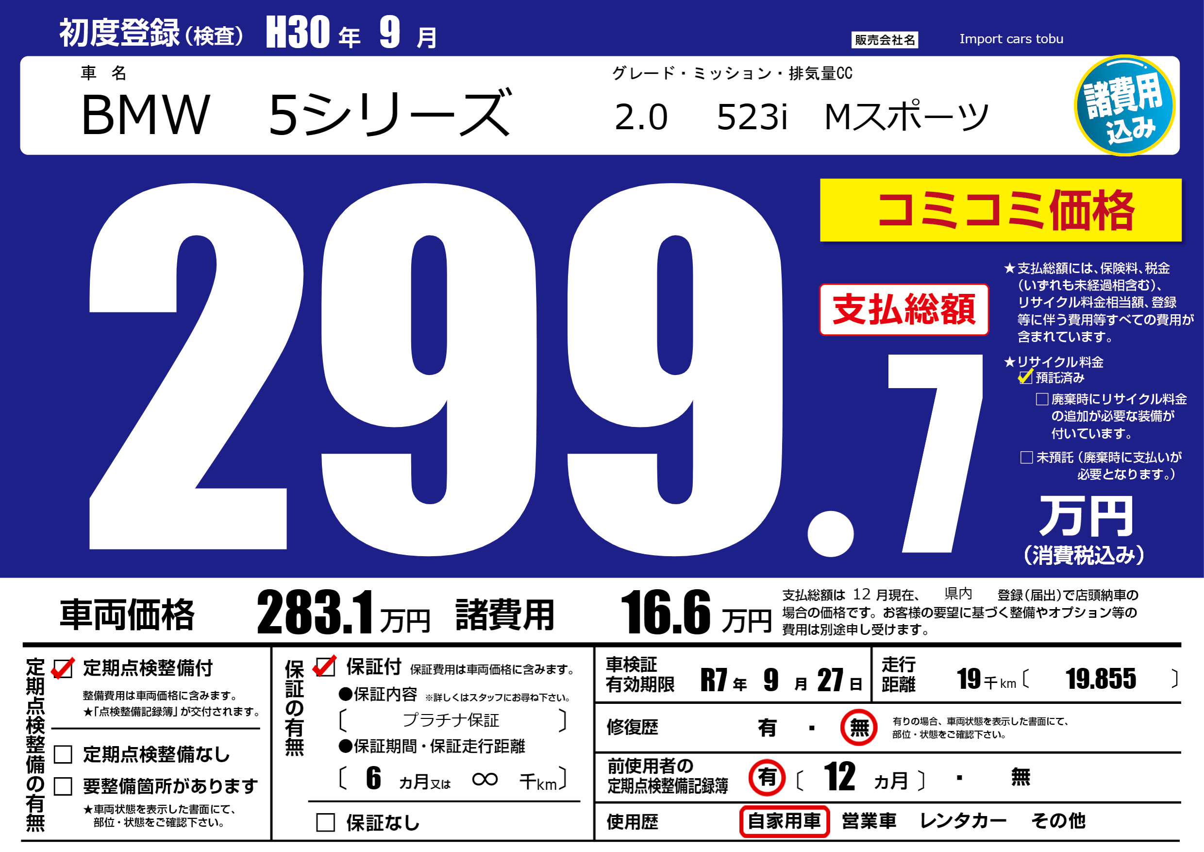 保証付き 保証内容( プラチナ保証) 6ヶ月または(∞)千kmまで |