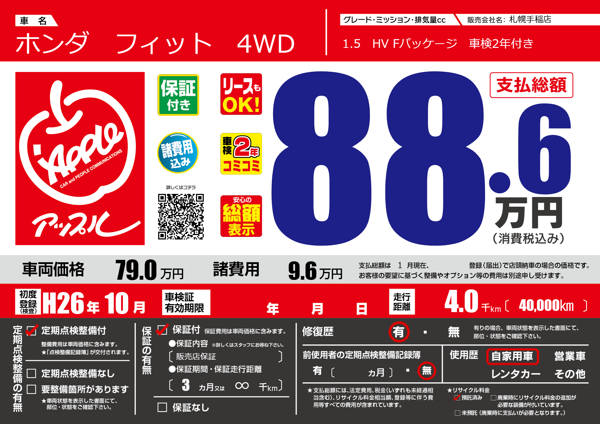 | 走行キロ | 0.4万km | 初年度登録 | H26年10月 |