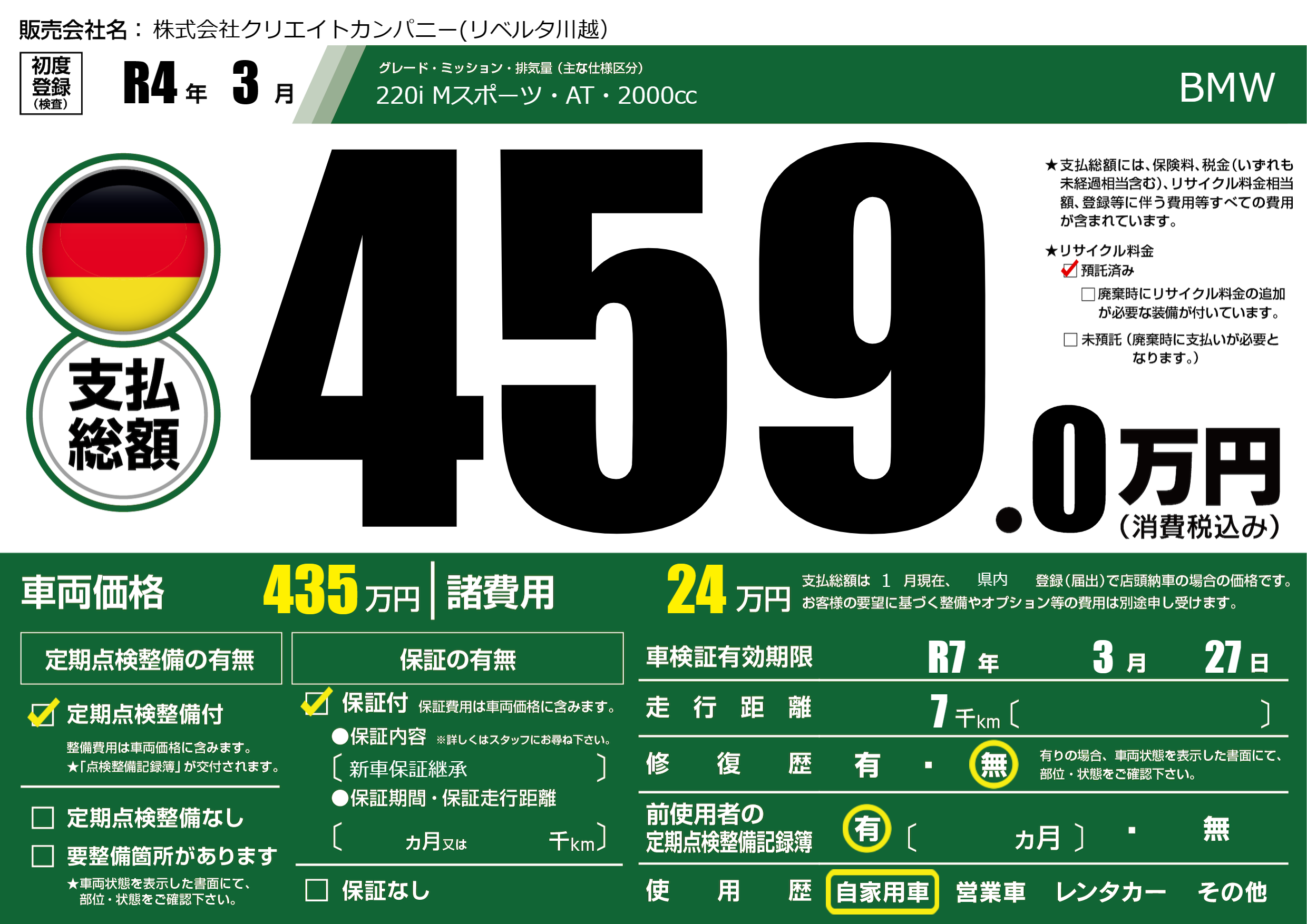 | 車検制限 | R7年 3月 27日 | ||