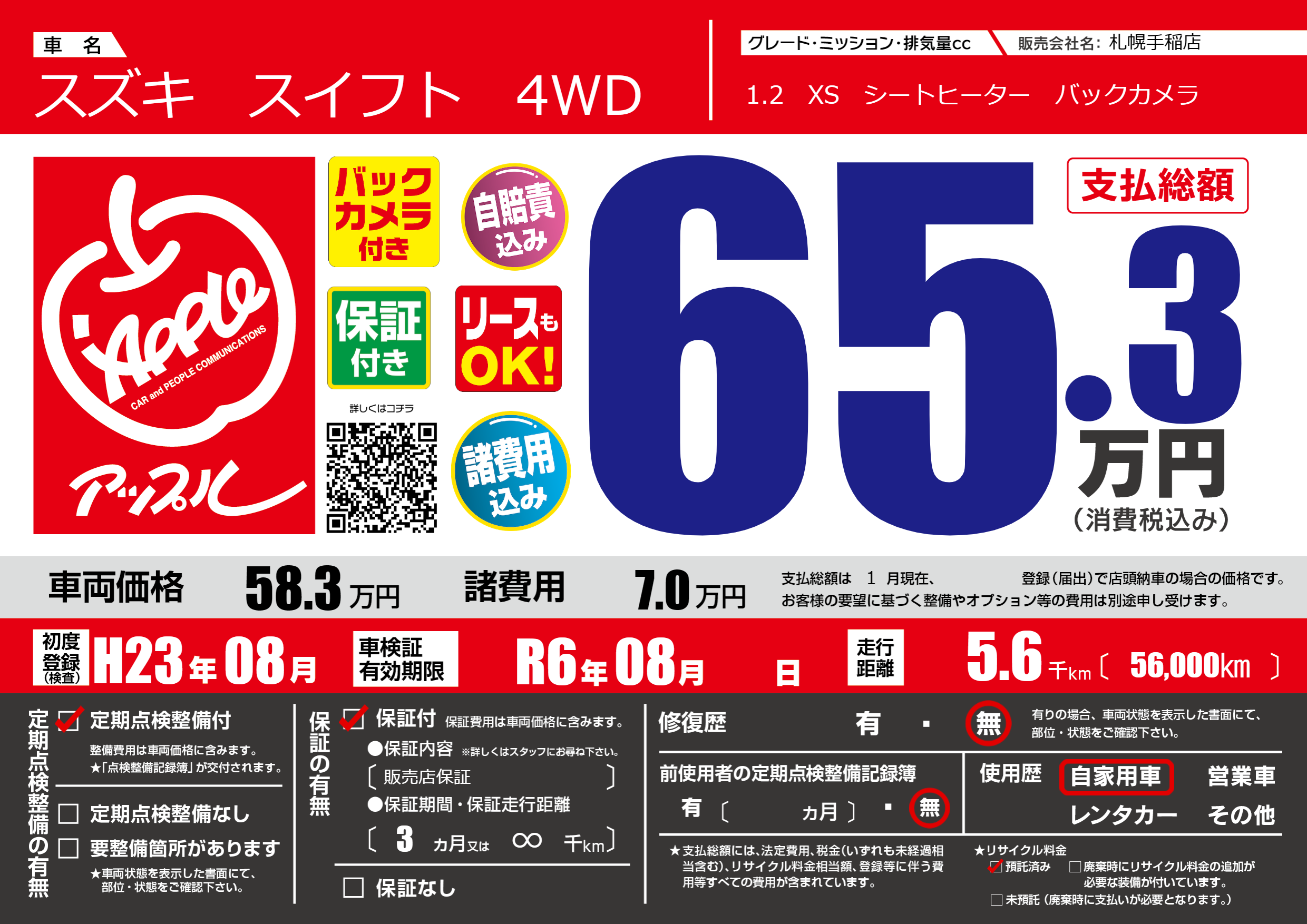 | 走行キロ | 0.5万km | 初年度登録 | H23年08月 |
