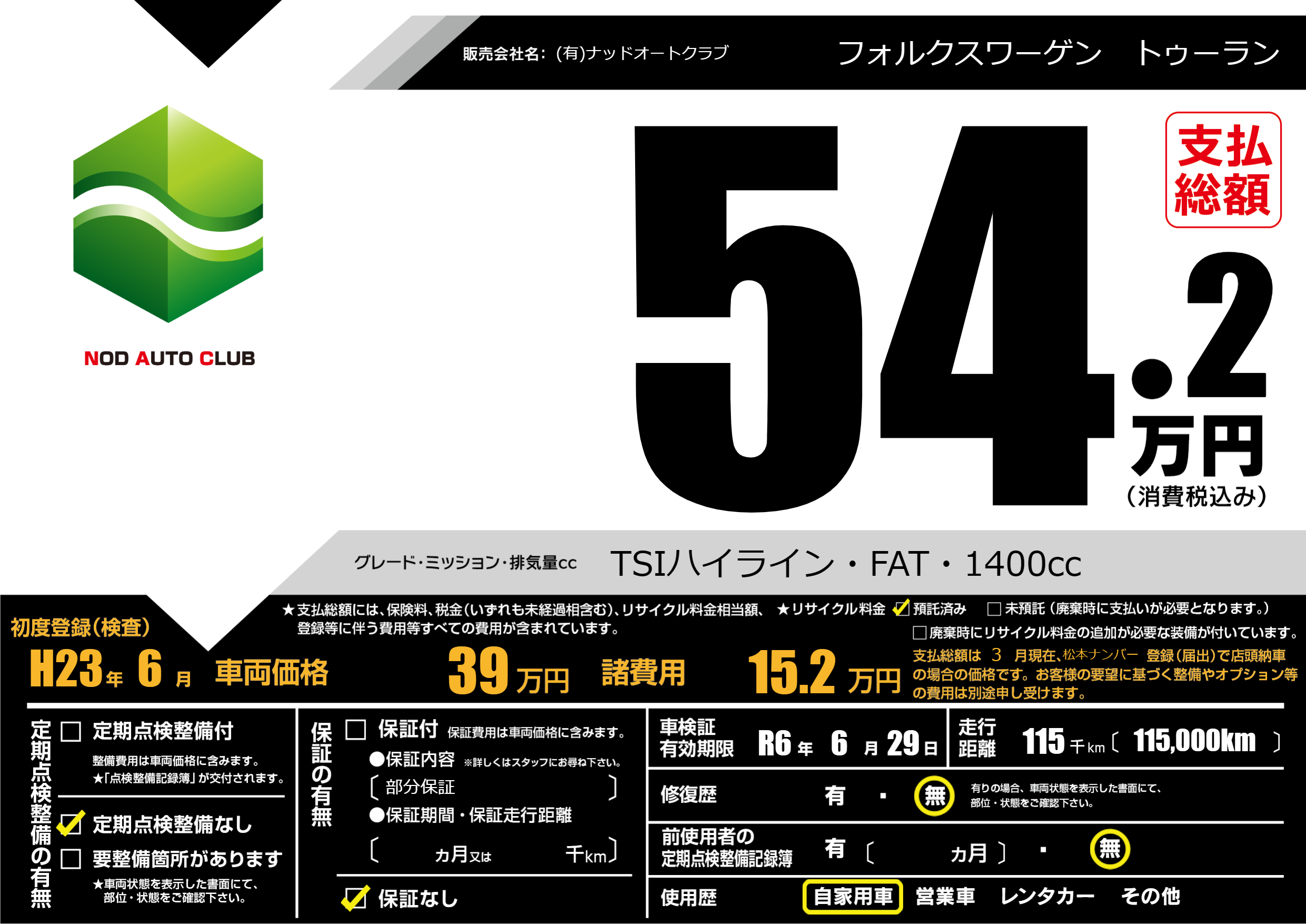 | 車名 | フォルクスワーゲン トゥーラン | グレード ミッション 排気量 |