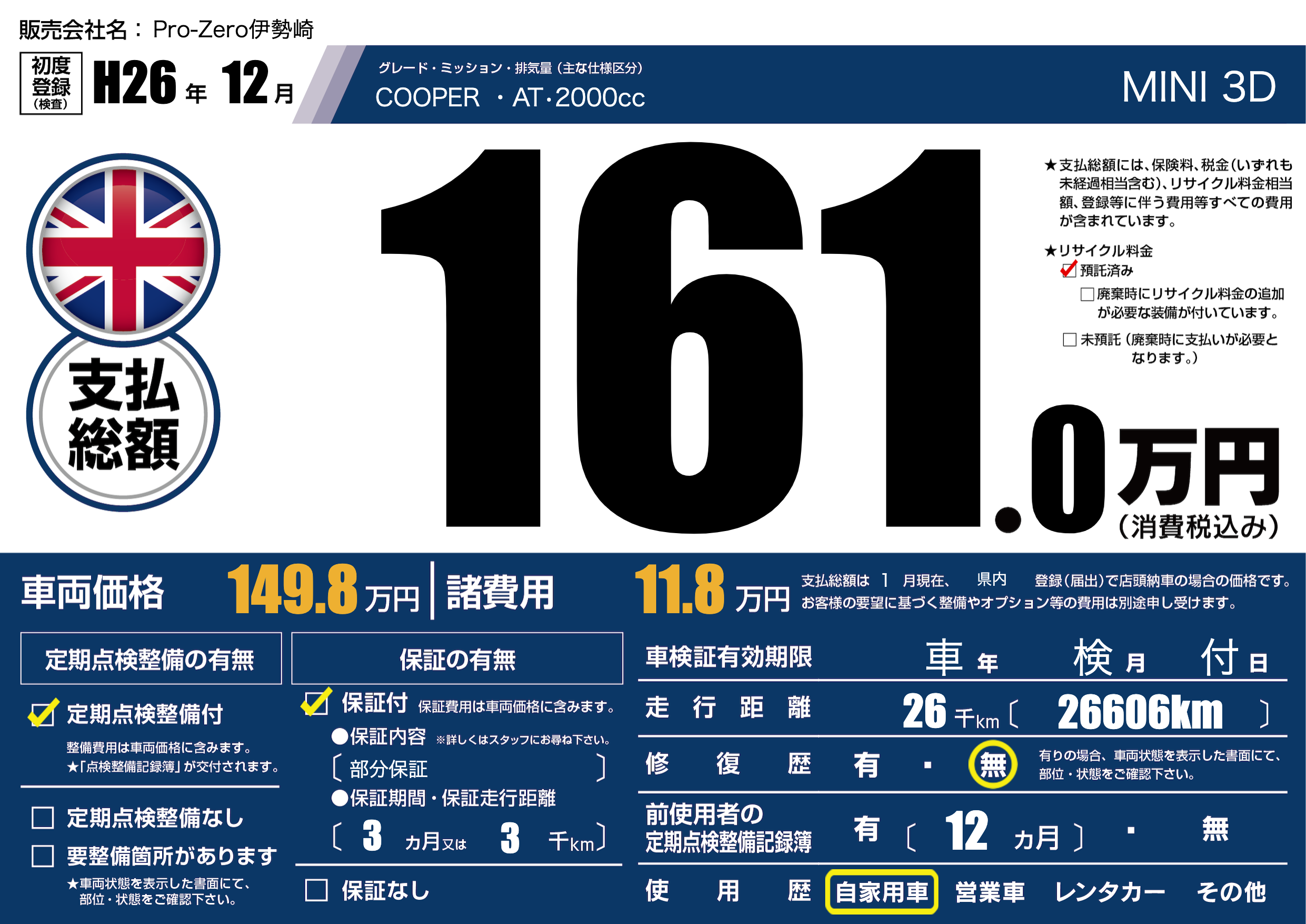 | 車名 | MINI 3D | グレード ミッション 排気量 |