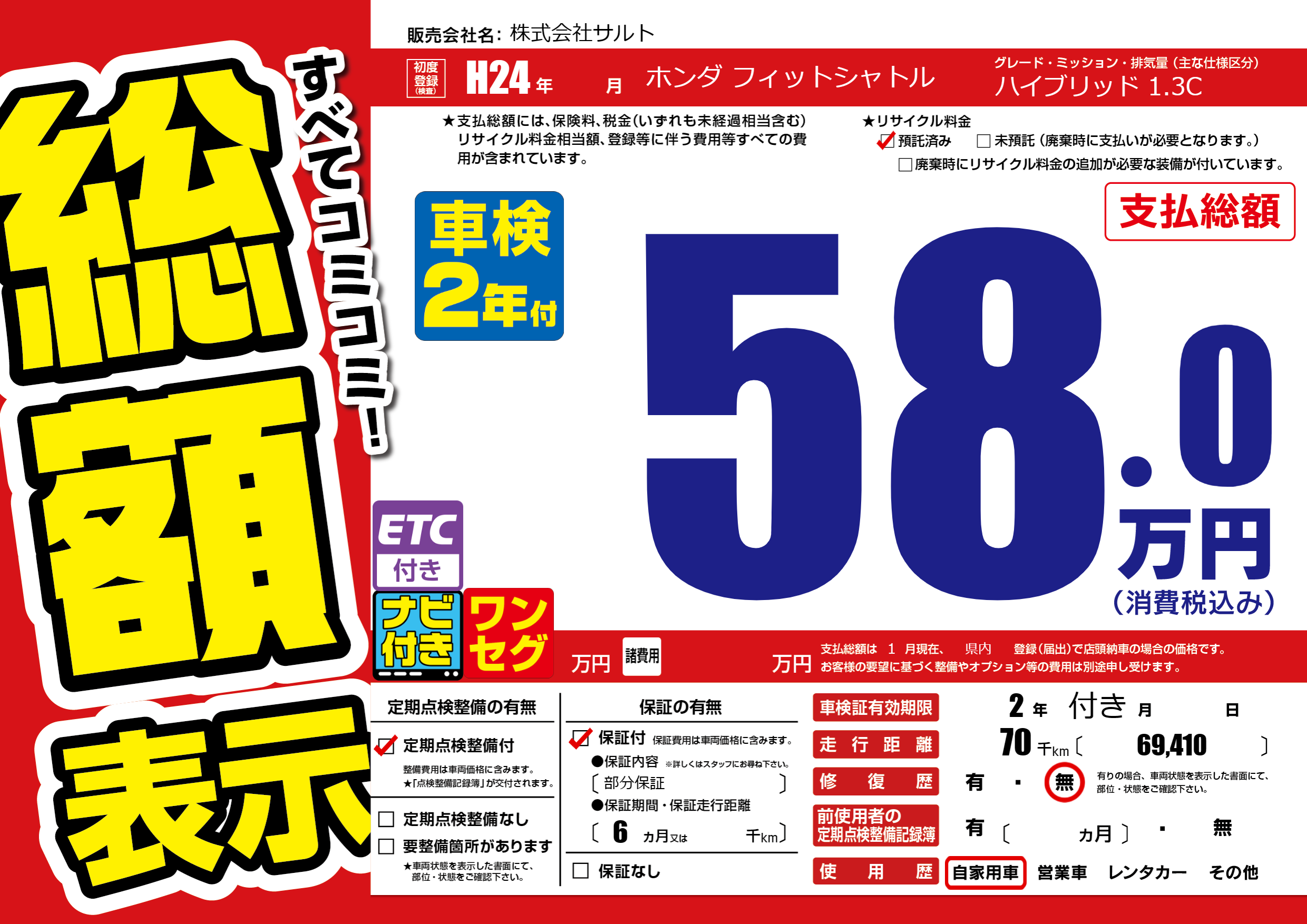 | 走行キロ | 7万km | 初年度登録 | H24年---月 |