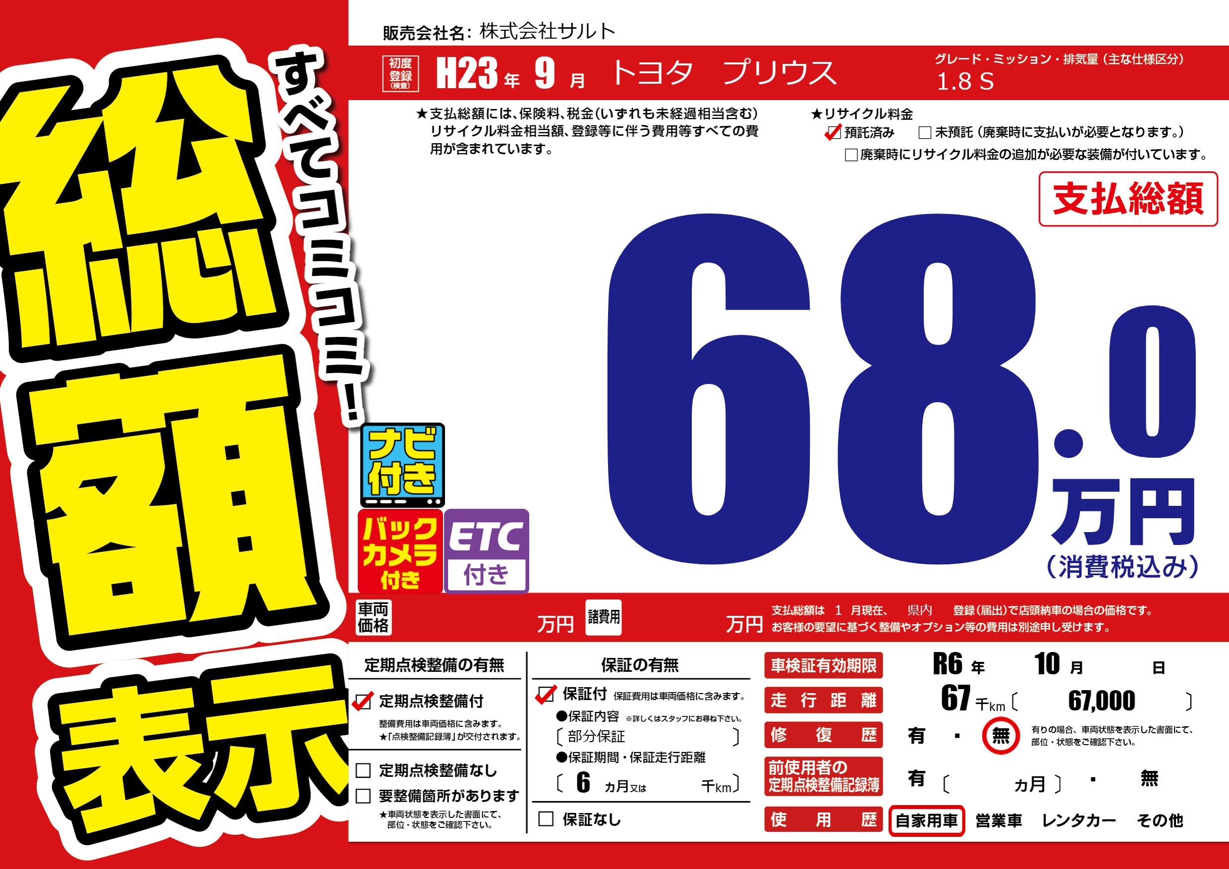 | 車名 | トヨタ プリウス | グレード ミッション 排気量 |