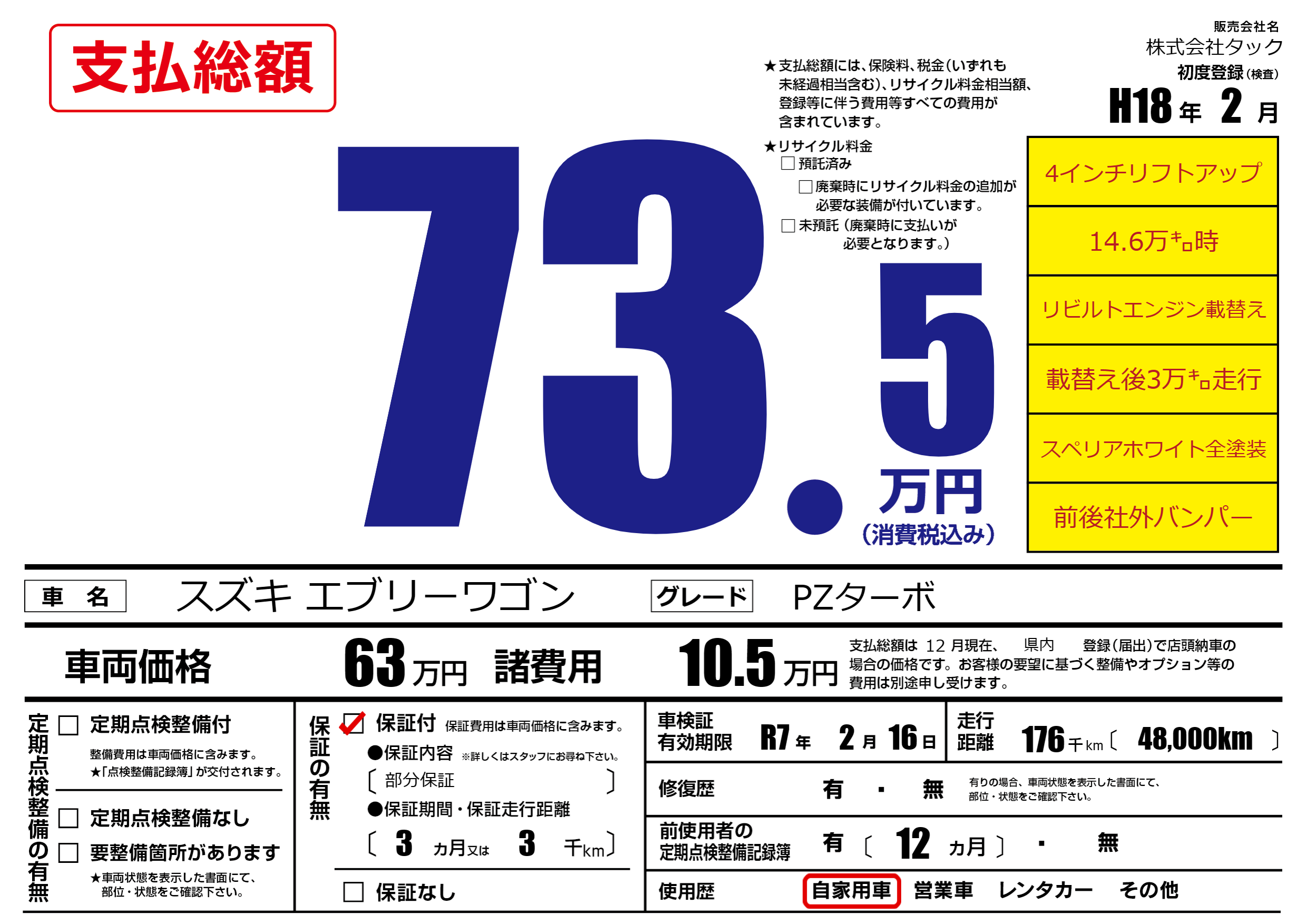 | 車名 | スズキ エブリーワゴン | グレード ミッション 排気量 |