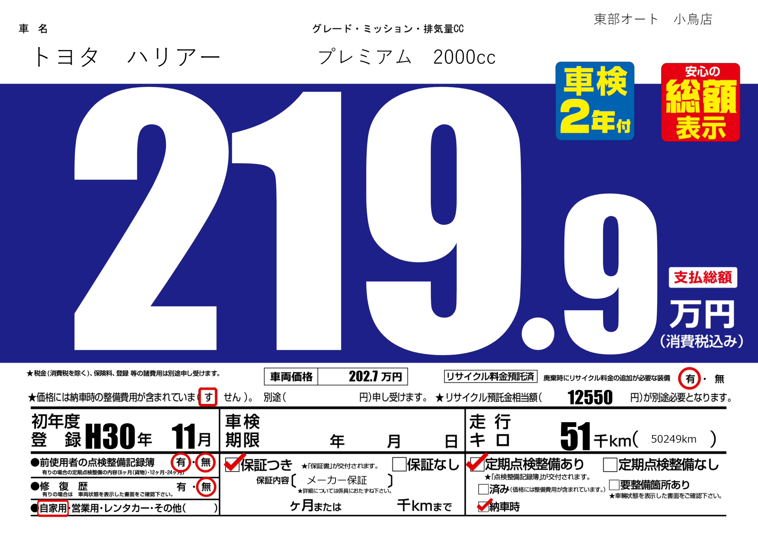 あり | リサイクル預託金相当額 | ( 12550円)が別途必要 |