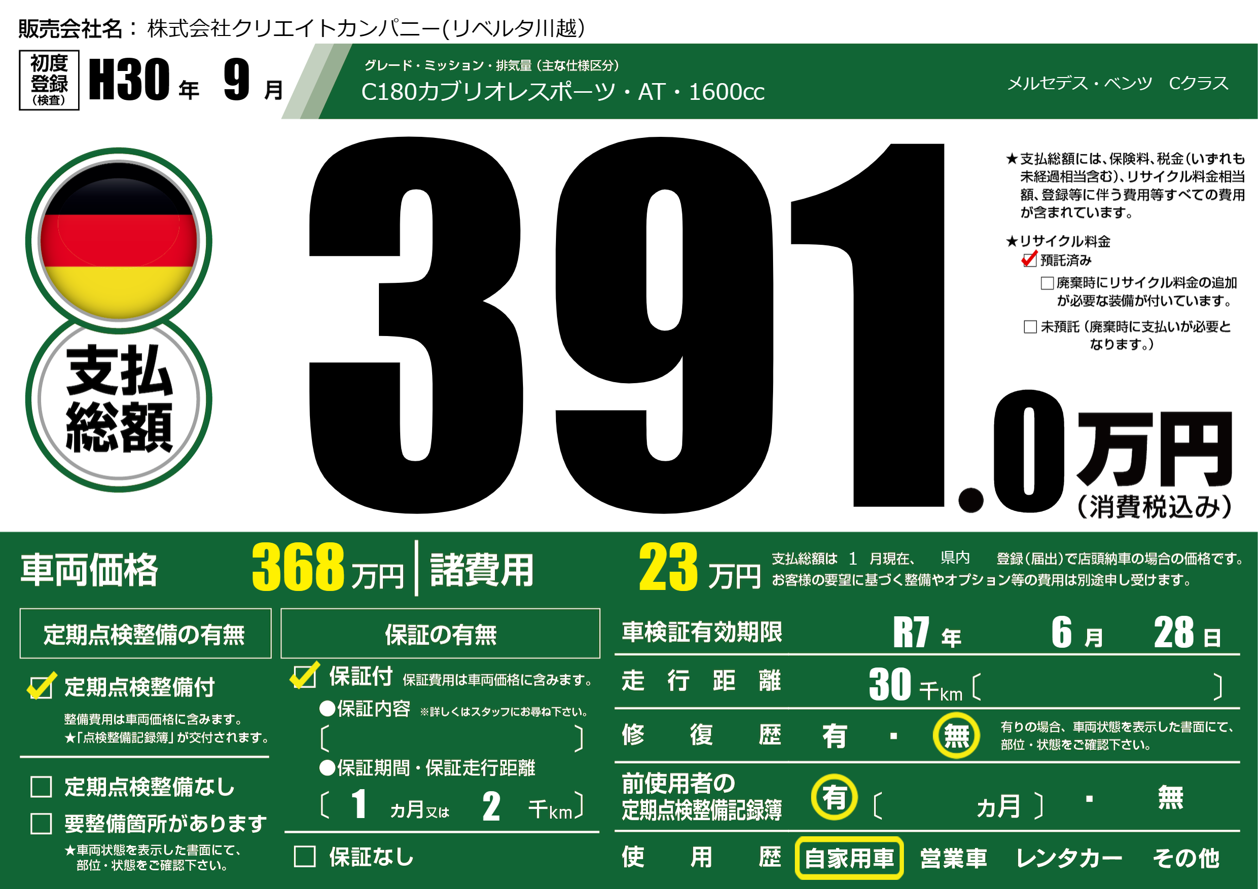 | 車名 | メルセデス・ベンツ Cクラス | グレード ミッション 排気量 |