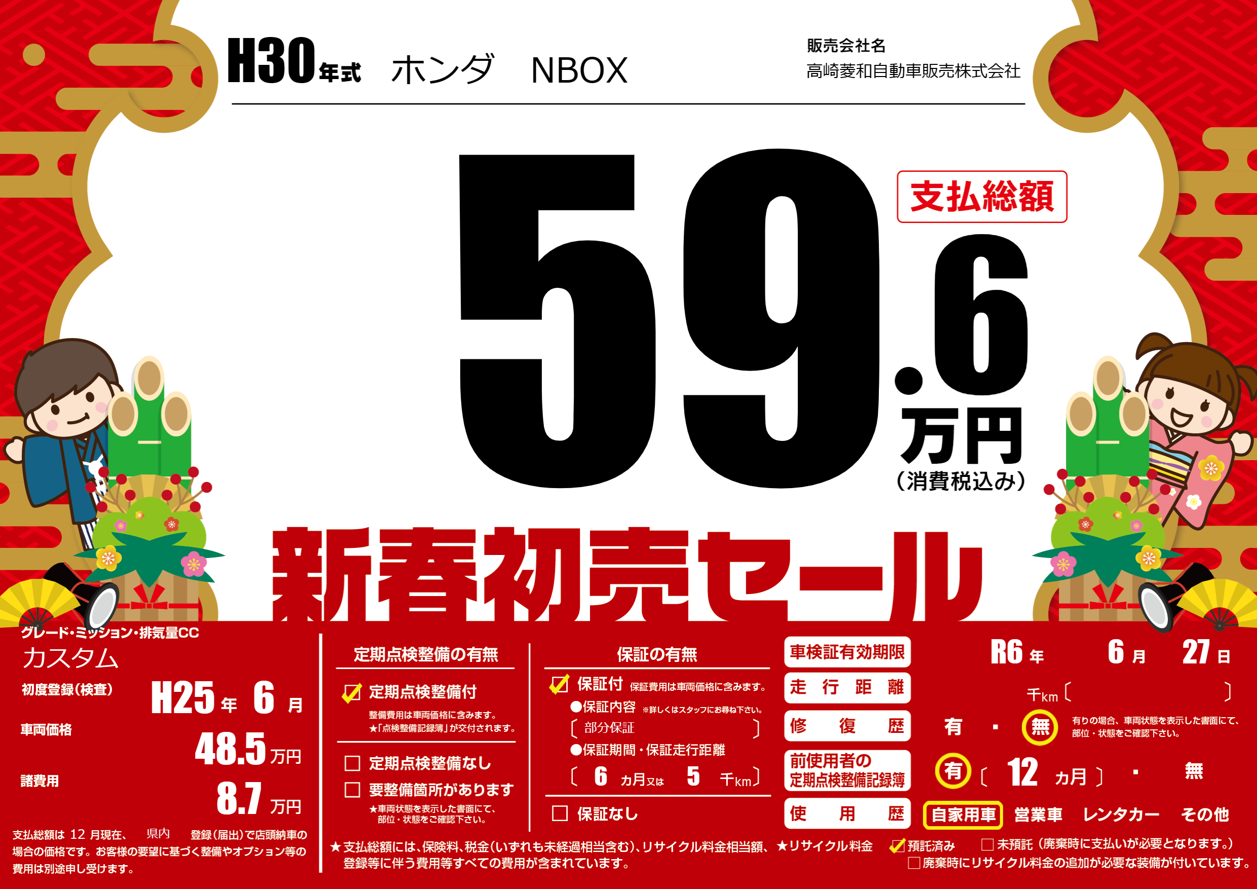 | 車名 | ホンダ NBOX | グレード ミッション 排気量 |